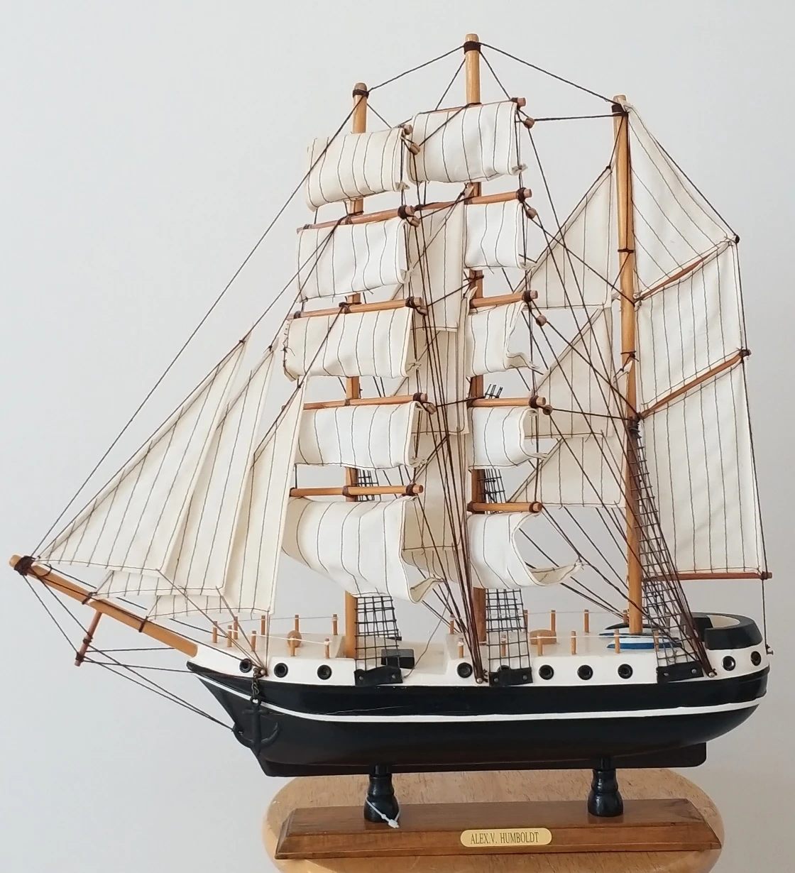 Wooden model sailing ship. Black and white hull. Cream coloured striped sails. Detailed rigging. Wooden display stand included. Collectible nautical décor.