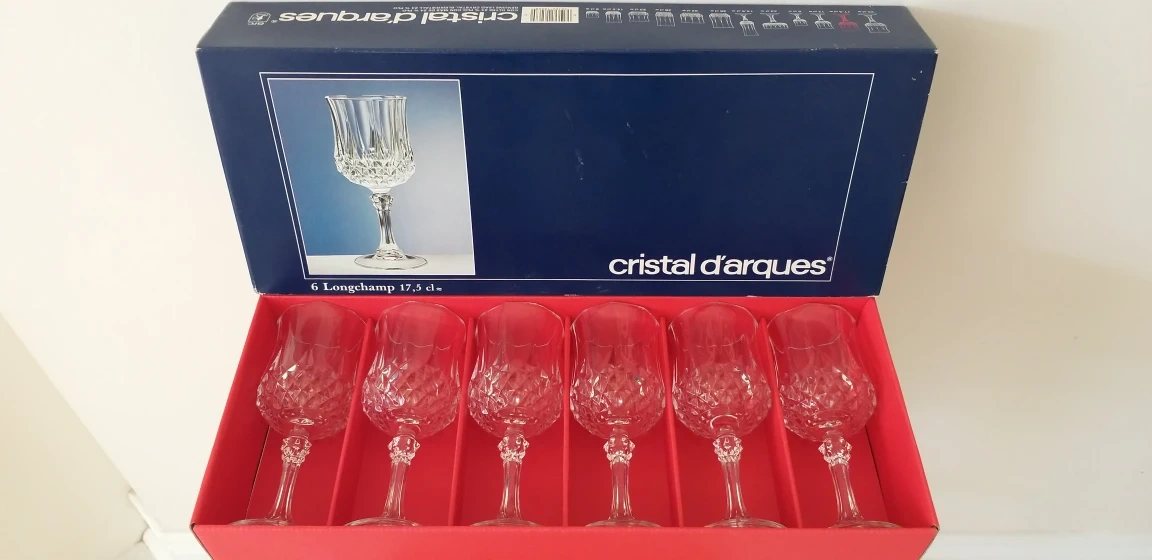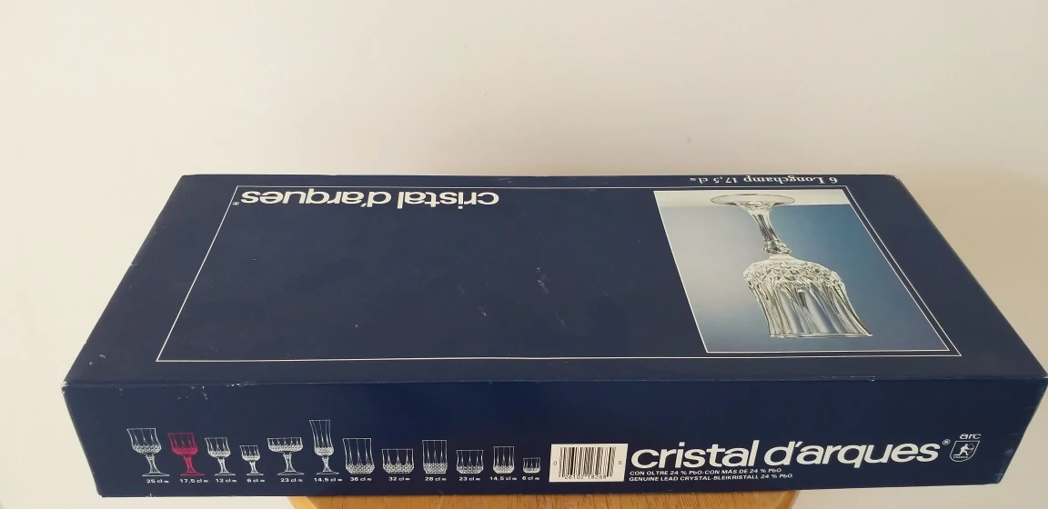 Set of six Cristal d'Arques Longchamp champagne flutes. New in box. Elegant design. Perfect for special occasions.
