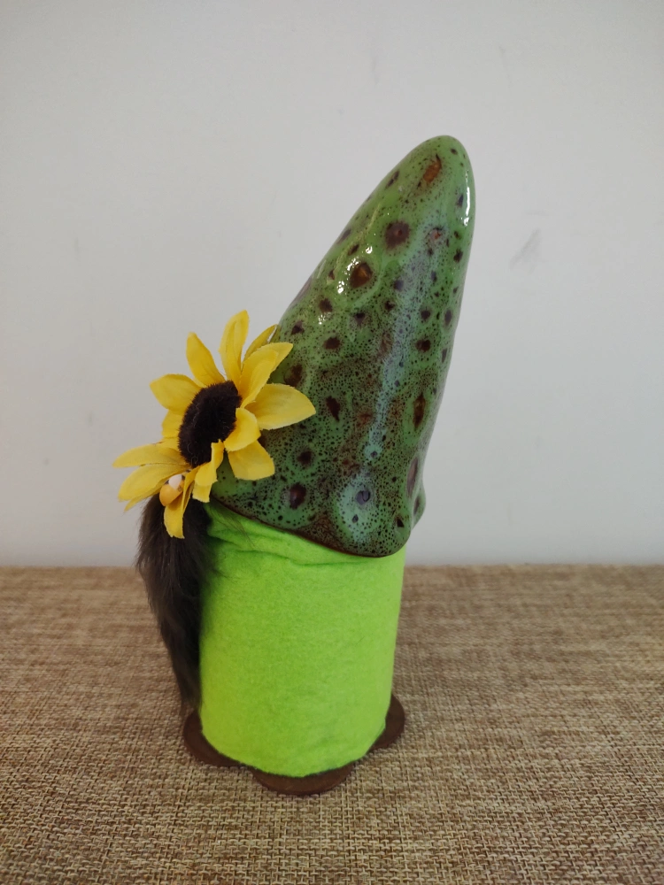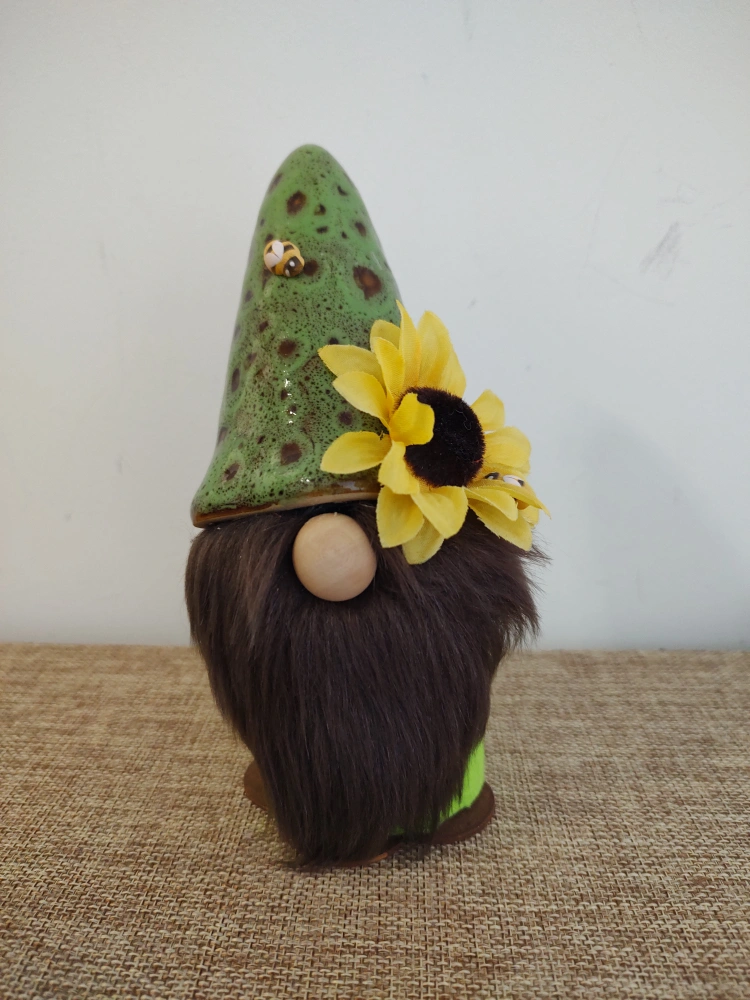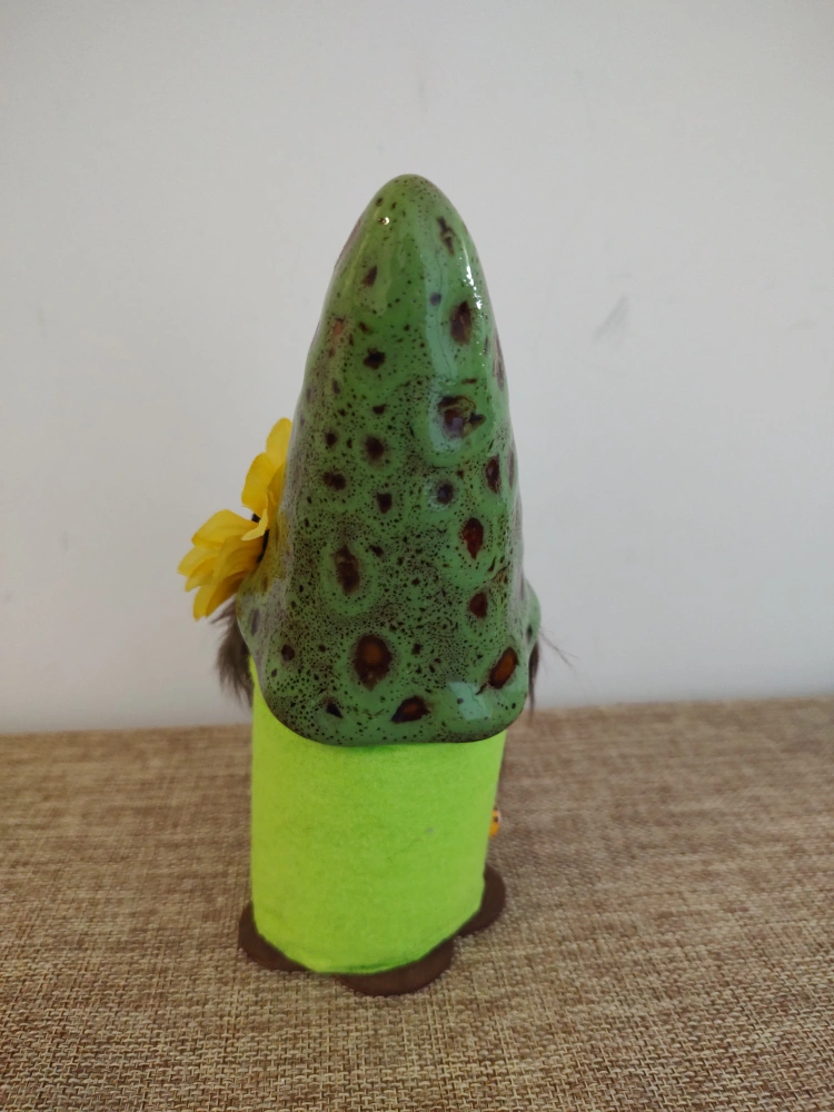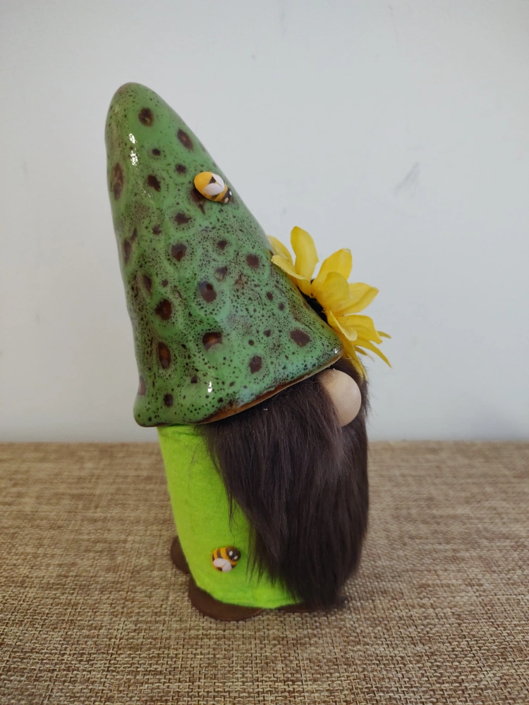 Unique gnome decoration. Features a speckled green ceramic hat, brown fuzzy beard, and yellow sunflower accent. Small bees are also present on the hat. Lime green felt body. Great addition to your home decor.