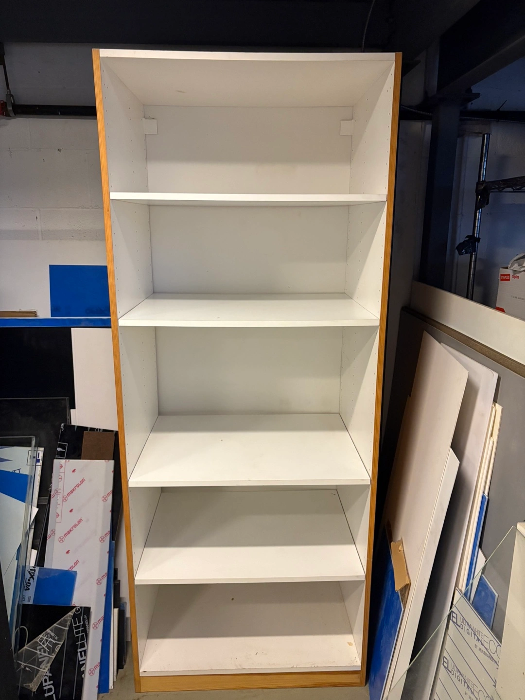 Good condition Tall Wooden Bookshelf - 5 Shelves Freestanding shelving unit. Five shelves. Light wood trim. White shelves. Good for storage. Assembled. Measurements in last couple of pics $35 Pick up Victoria Park and O’Connor area