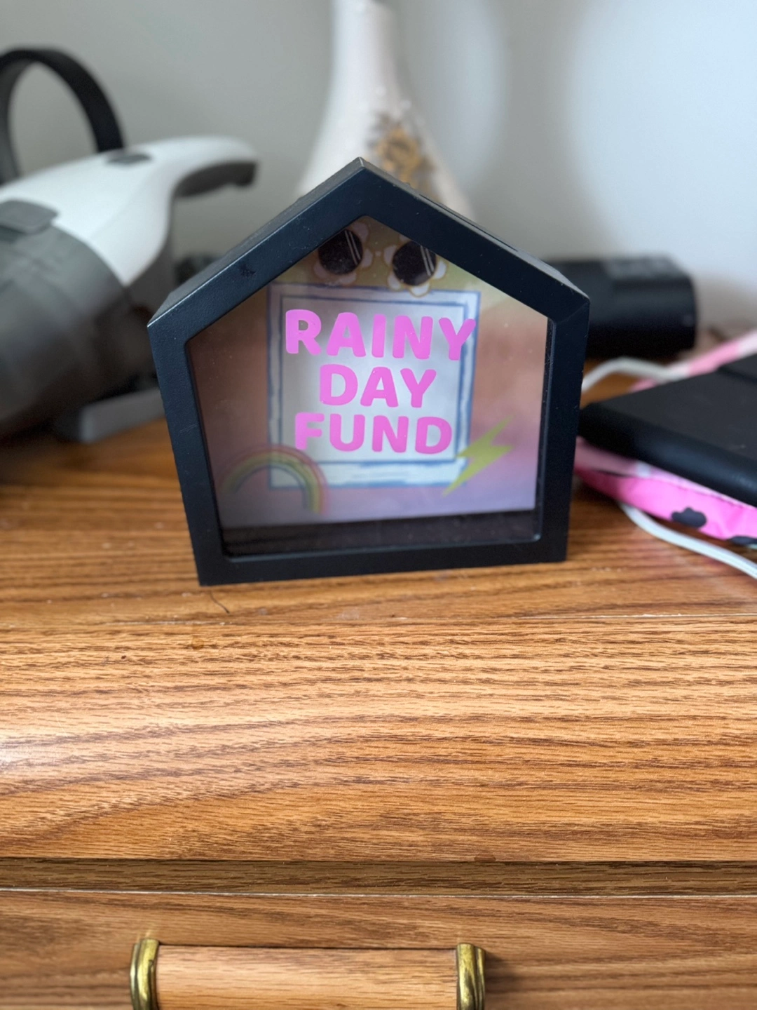 Cute house-shaped money box. Features a pink "Rainy Day Fund" design. Perfect for saving money.