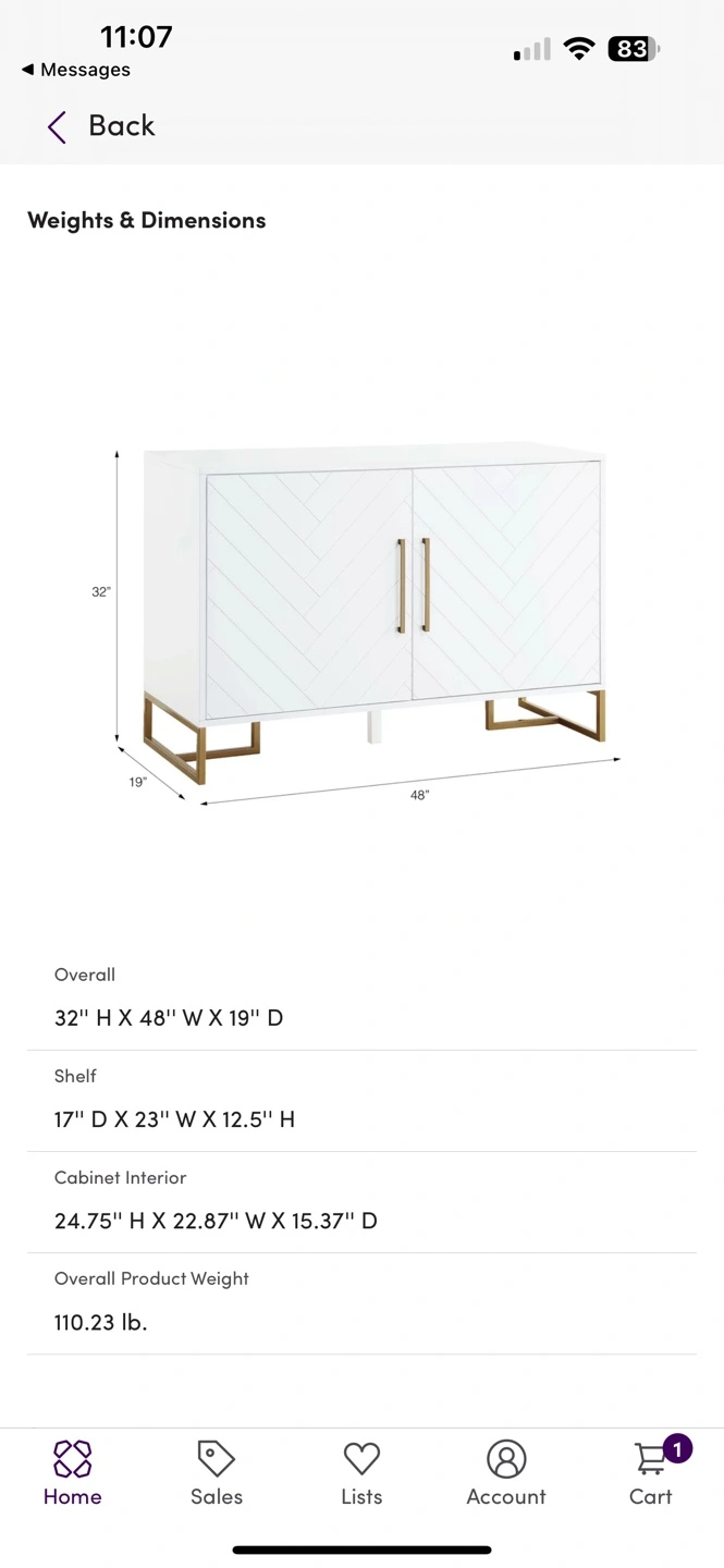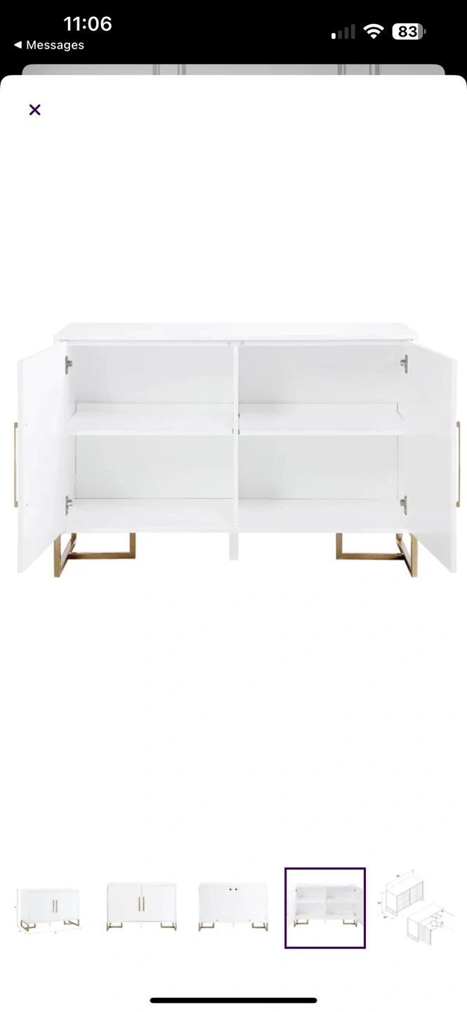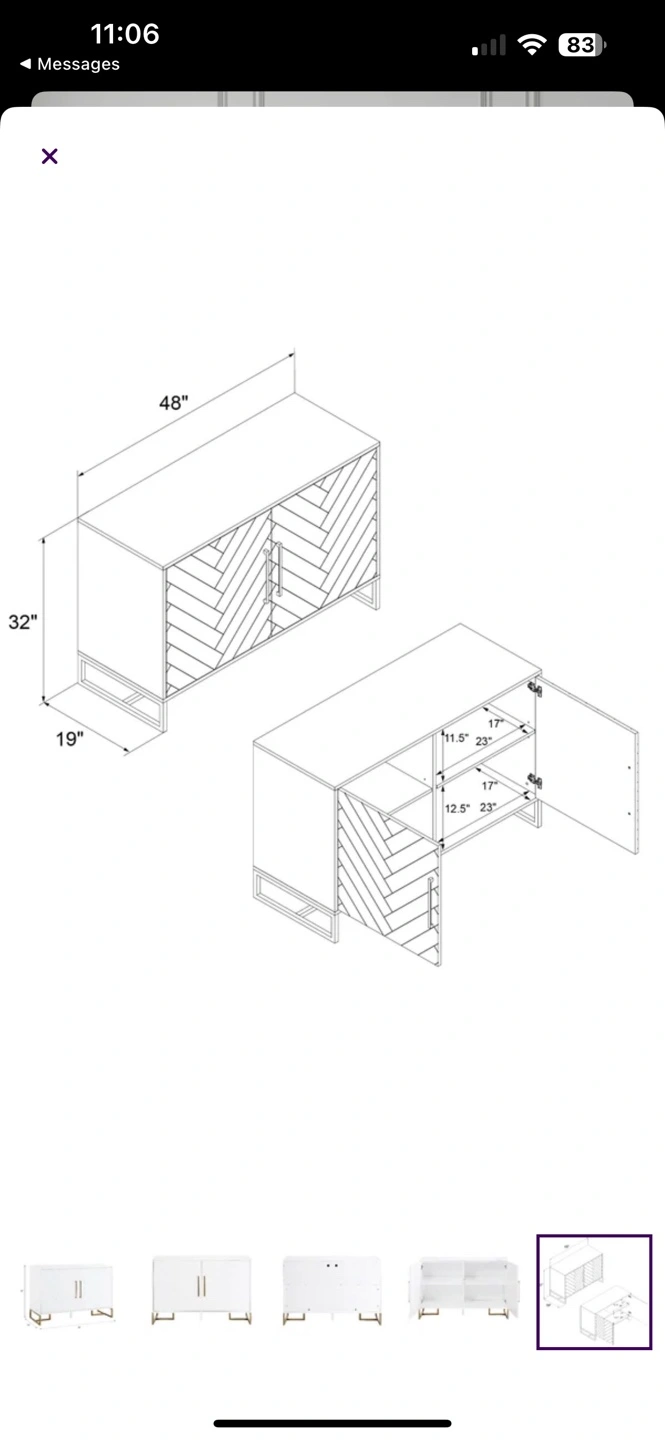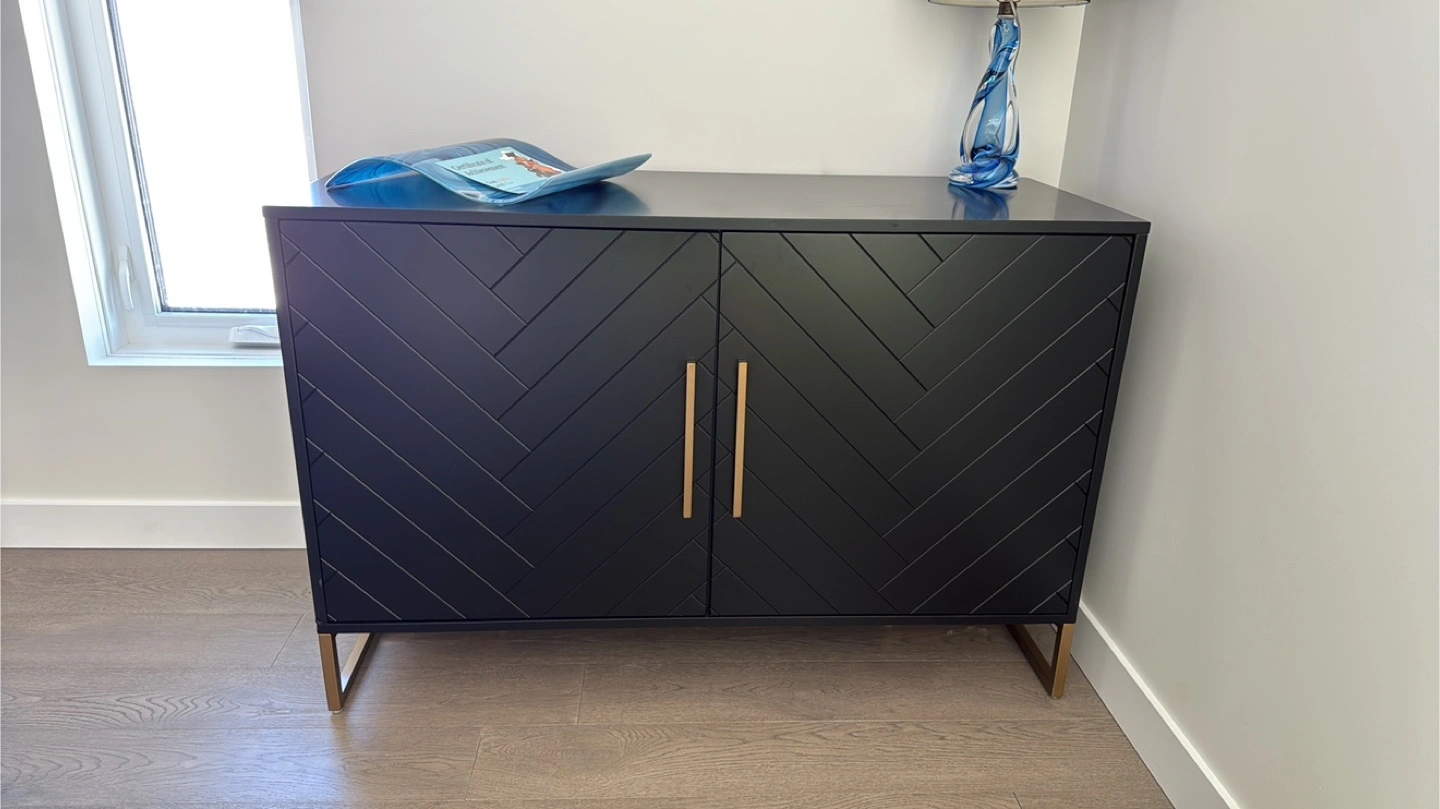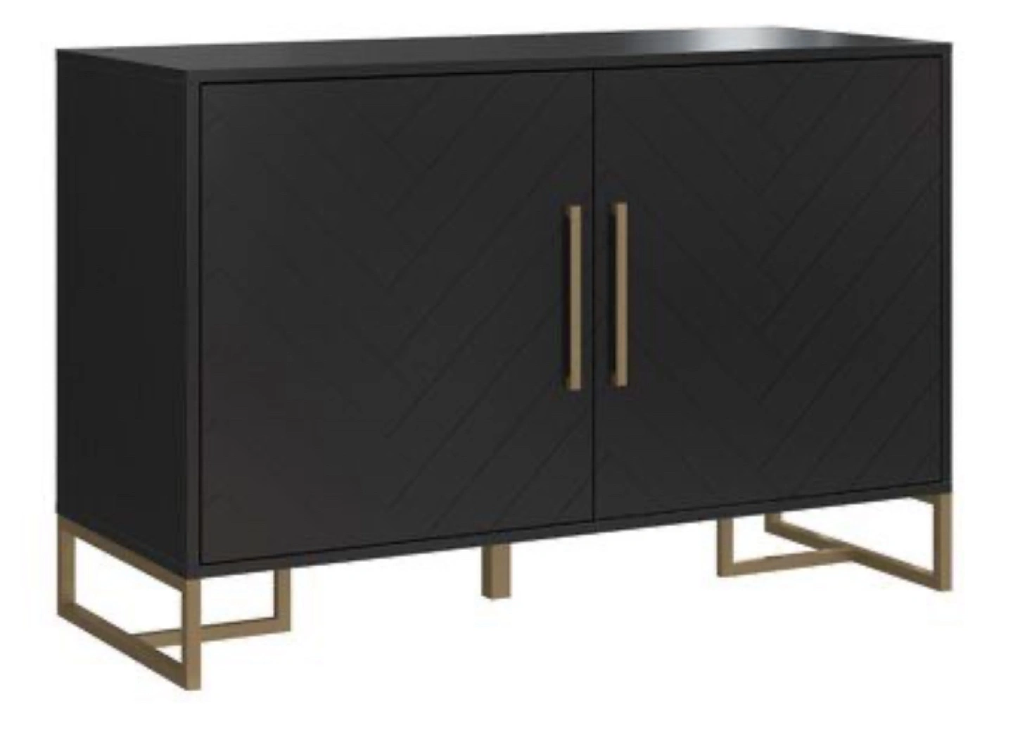 Modern accent cabinet. Black finish with gold metal legs. Chevron pattern doors. Two compartments. Measurements: 32"H x 48"W x 19"D. Great for entryway or living room. One new in box ($350) and one built and like new ($300)