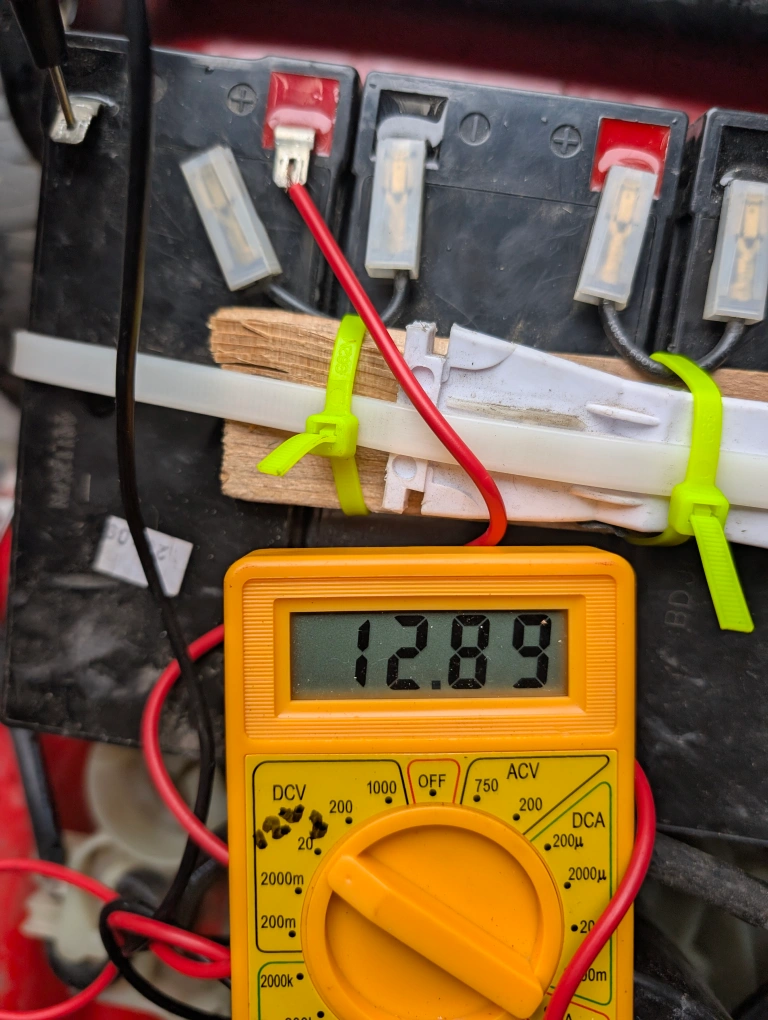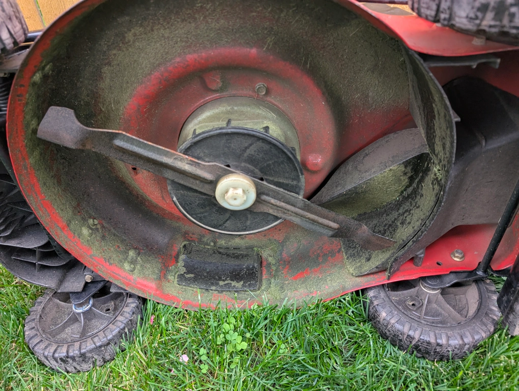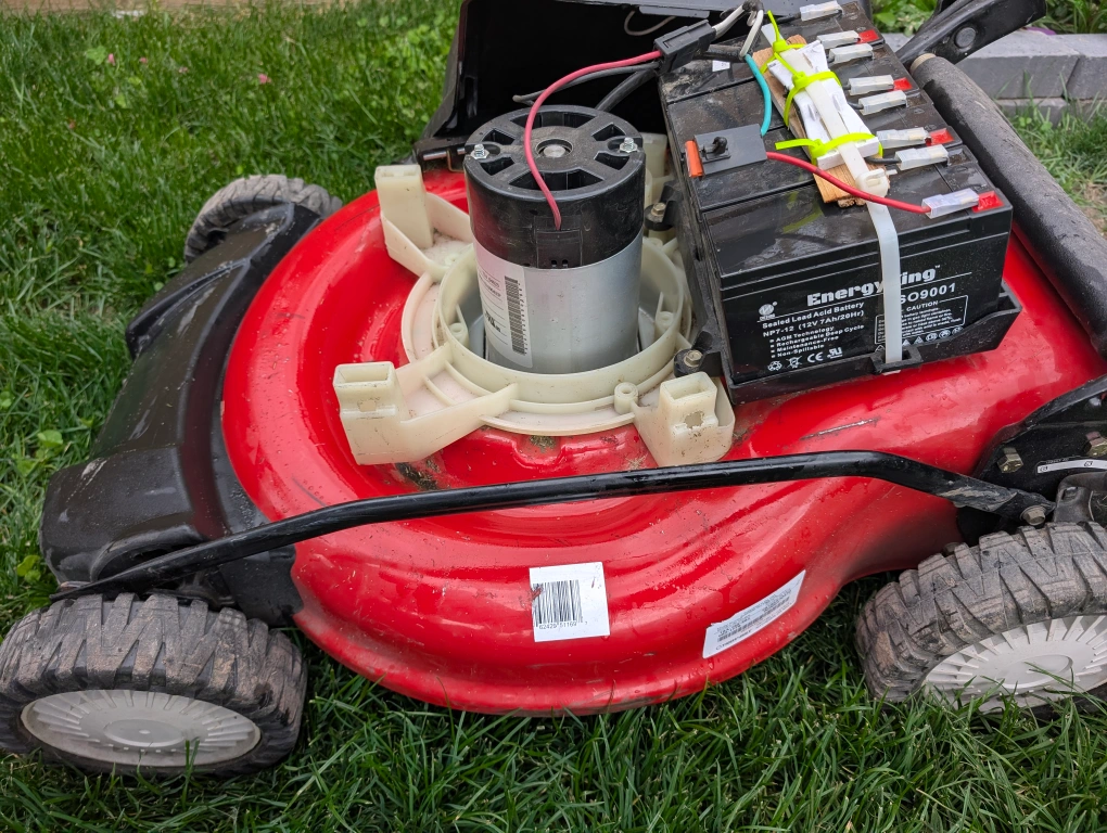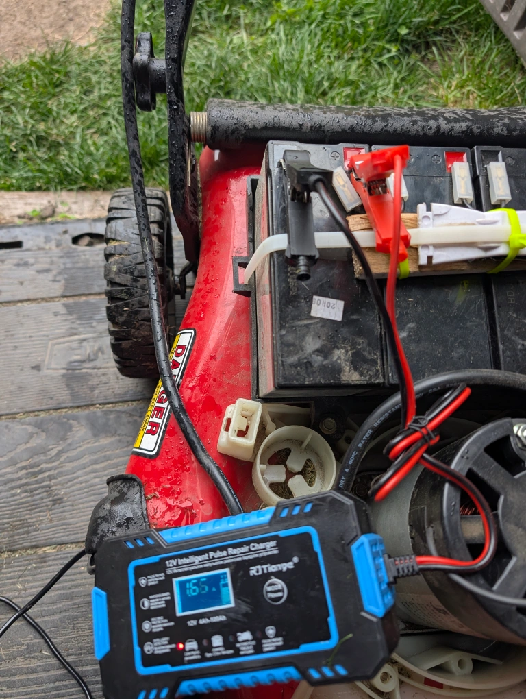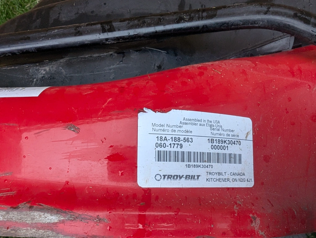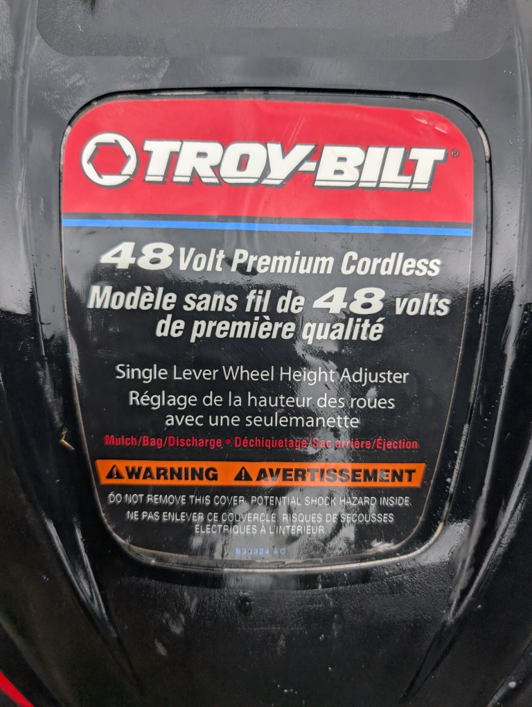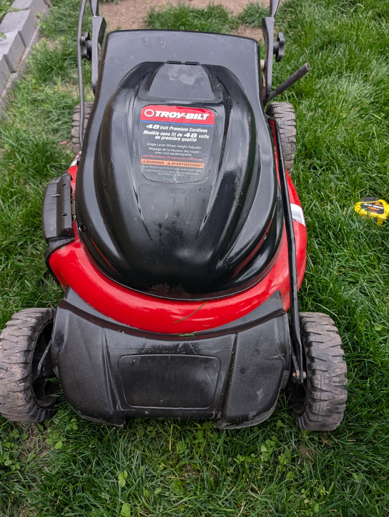 One of the ends of the charging cord broke off so I'm throwing in a 12 volt battery charger that is $25 and is brand new The top cover of the lawn mower comes off easily making it easy to charge each battery individually. The red clamp goes on the positive end of the 12-volt battery in the black clamp goes on the negative terminal of about 12 volt battery It takes 1 hour from recharge a completely dead battery to full This 48 volt Troy-Bilt lawn mower is a 21-in model. It has a black plastic insert in the back that provides the mulch feature. Therefore, there's no need have a grass catcher. Very convenient feature! Blade is in excellent condition. 3 of the 4 batteries are brand new. I have additional pictures I can send you to show the actual voltage of every single battery. All them above 12.78 volts Great for a medium sized lawn