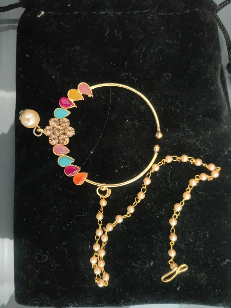 Gorgeous nose ring. Features gold-tone metal, colourful stones, and a pearl accent. Delicate chain. Perfect for adding a touch of elegance. Only worn once and didn't wear inside the nose but I dangled it off my own nose piercing. Sterilized and cleaned