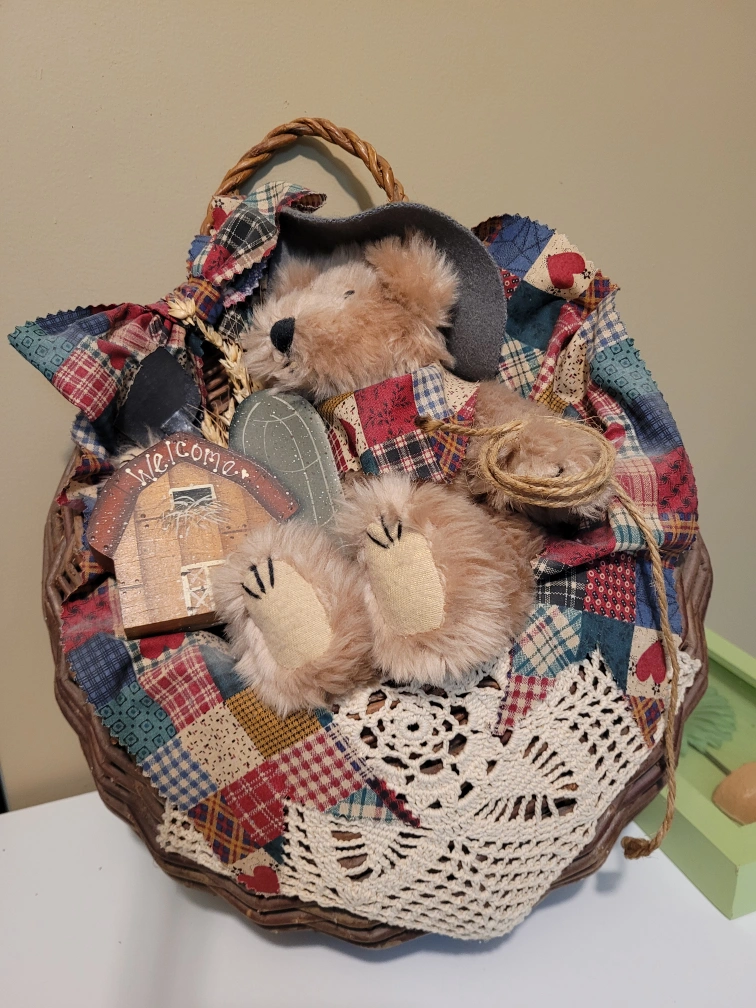 Cute stuffed bear nestled in a round patchwork basket. Features a welcome sign and rope accents. Perfect rustic decor.