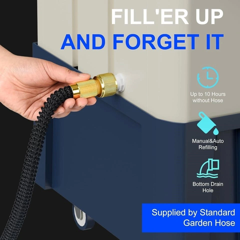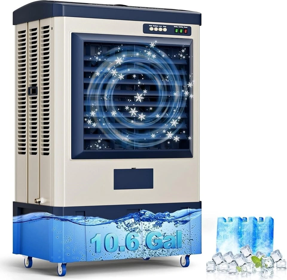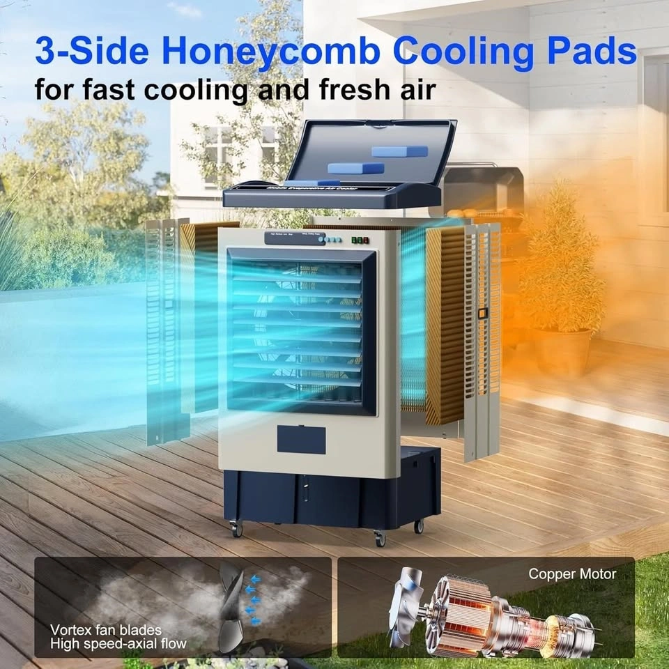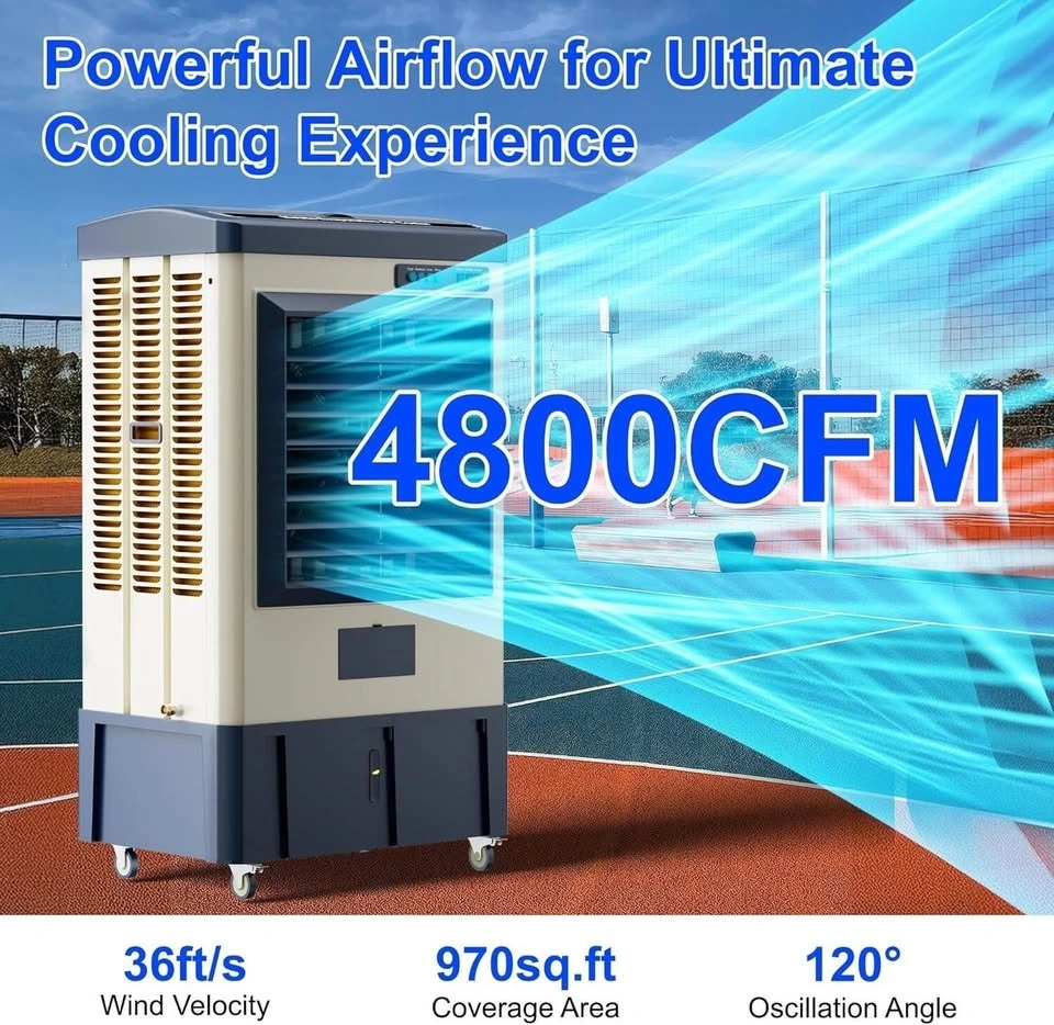 Retails $599+tax 4800 CFM Evaporative Air Cooler with Continuous Auto Fill Portable Swamp Cooler for Commercial Industrial Garage Patio Use 10.6 Gal Water Tank 3 Speeds 120 Degree Oscillation Gray High capacity evaporative cooler built for large spaces. Delivers 4800 CFM airflow with 120 degree oscillation to cover up to 970 sq ft. 10.6 gallon tank supports long runs, with manual top fill or hose hookup for continuous auto fill. Galvanized iron housing handles commercial and outdoor use. Three cooling pads and three ice boxes boost cooling. Heavy duty casters with two locks for stable placement. Type: High capacity evaporative swamp cooler Airflow: 4800 CFM Coverage area: Up to 970 sq ft Water tank: 10.6 gal Refill options: Manual top fill and continuous auto fill via hose Cooling media: 3 high density pads Ice boxes: 3 included Speeds: 3 Oscillation: 120 degrees Wattage: 660 W Material: Galvanized iron Color: Gray Form factor: Portable Dimensions: 17 in D x 23 in W x 41 in H Mobility: 4 casters 2 lockable Included: Cooler unit; 3 ice boxes Please note the specifications are approximate and may vary slightly. This item has been tested and is functional. Off Season Price to clear storage, in Summer it will be Atleast $250. Buy now save later.