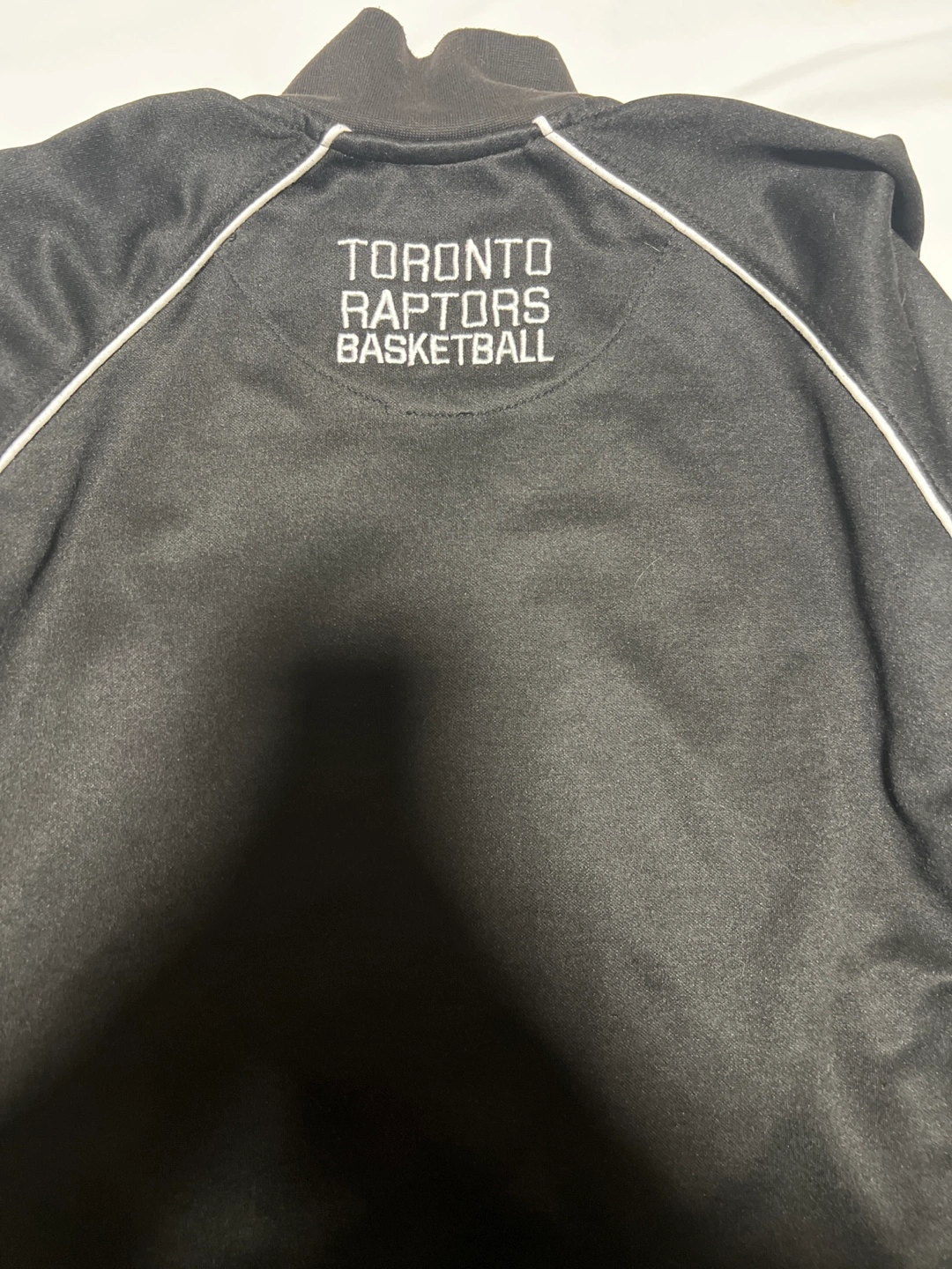 Black track jacket. Features white side stripes and Toronto Raptors logo. Full zip closure. Men's size medium.