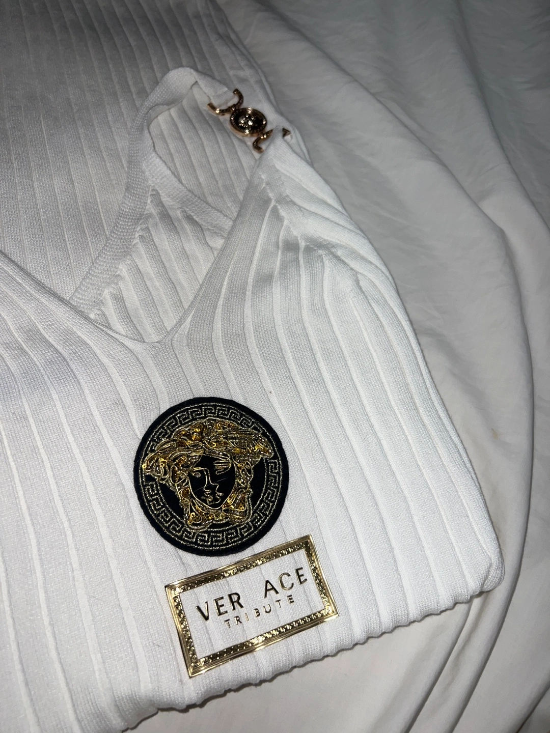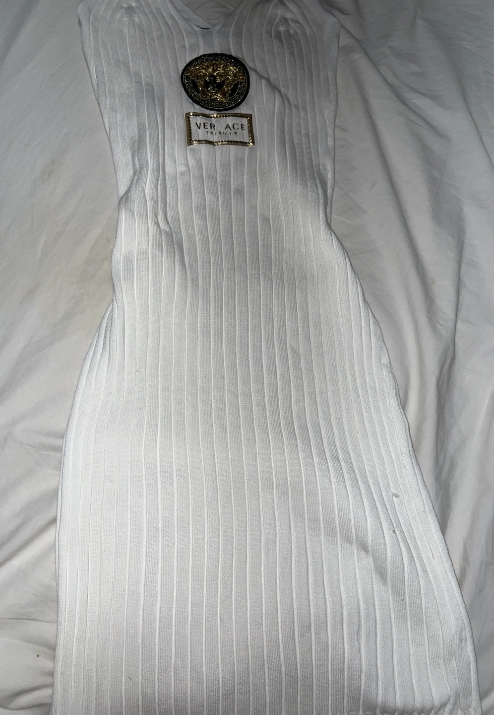 I also have one in black and gold! I can do a deal for both as well! Very stretchy material. Stunning white ribbed knit mini dress. Features gold Versace Tribute logo and accents. Unique design. Excellent condition.