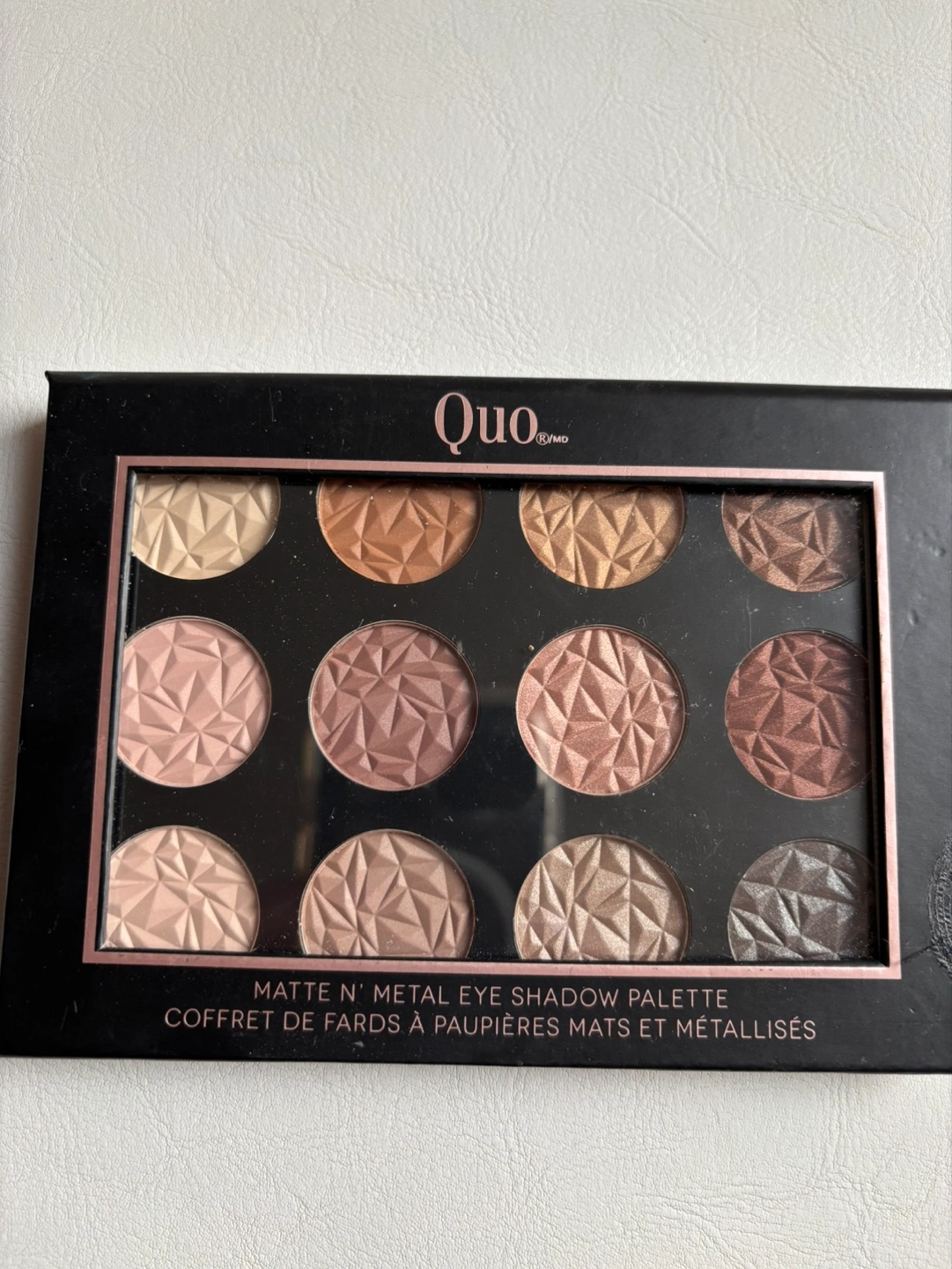 12-pan eyeshadow palette. Neutral shades. Matte and metallic finishes. Compact design.