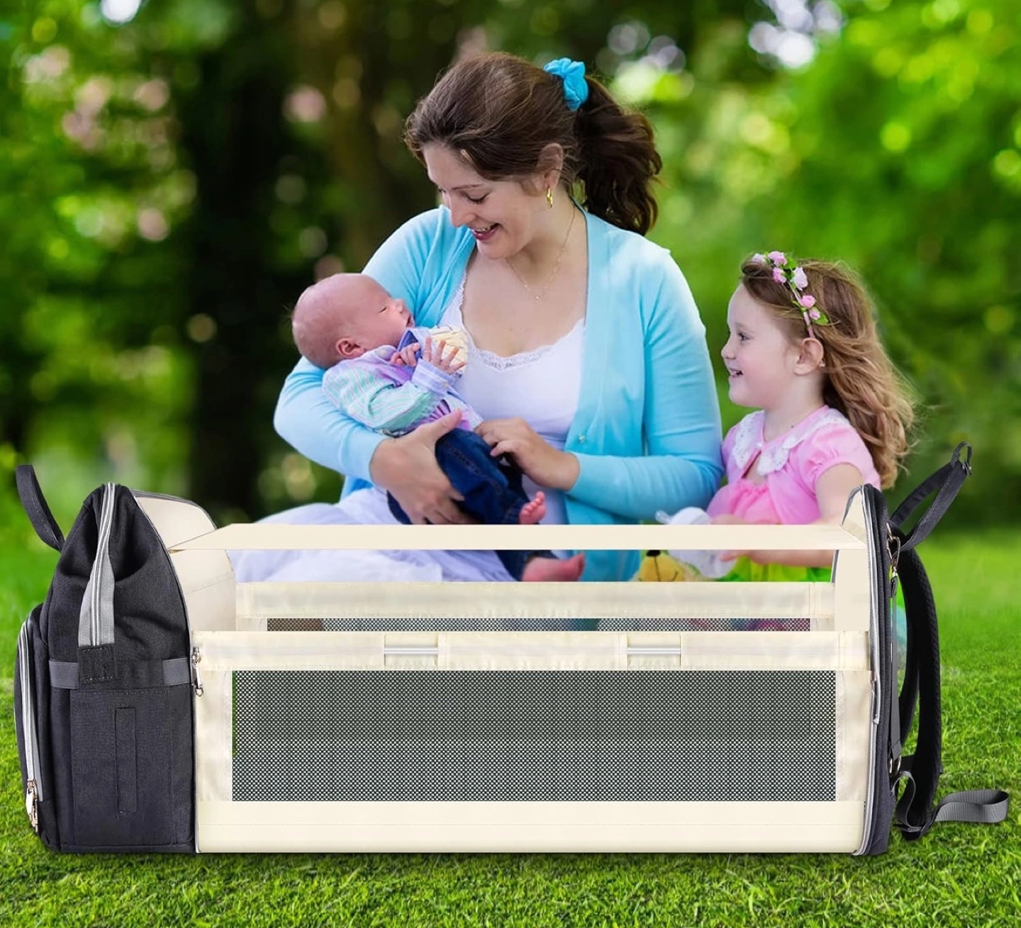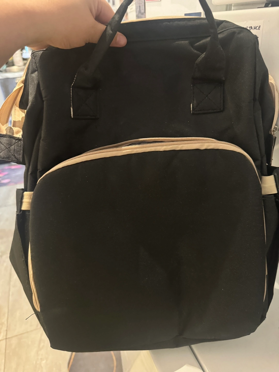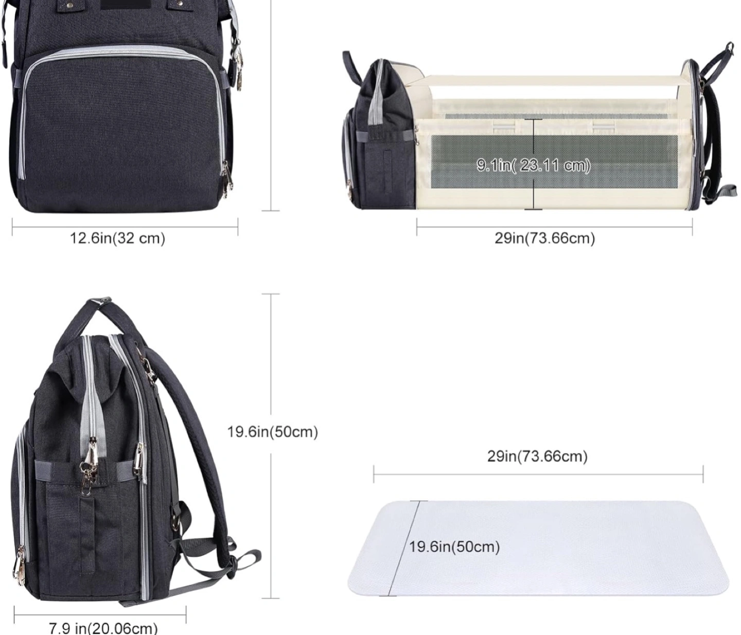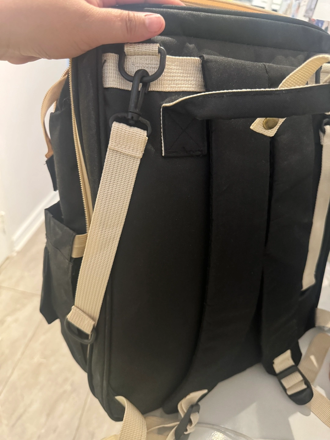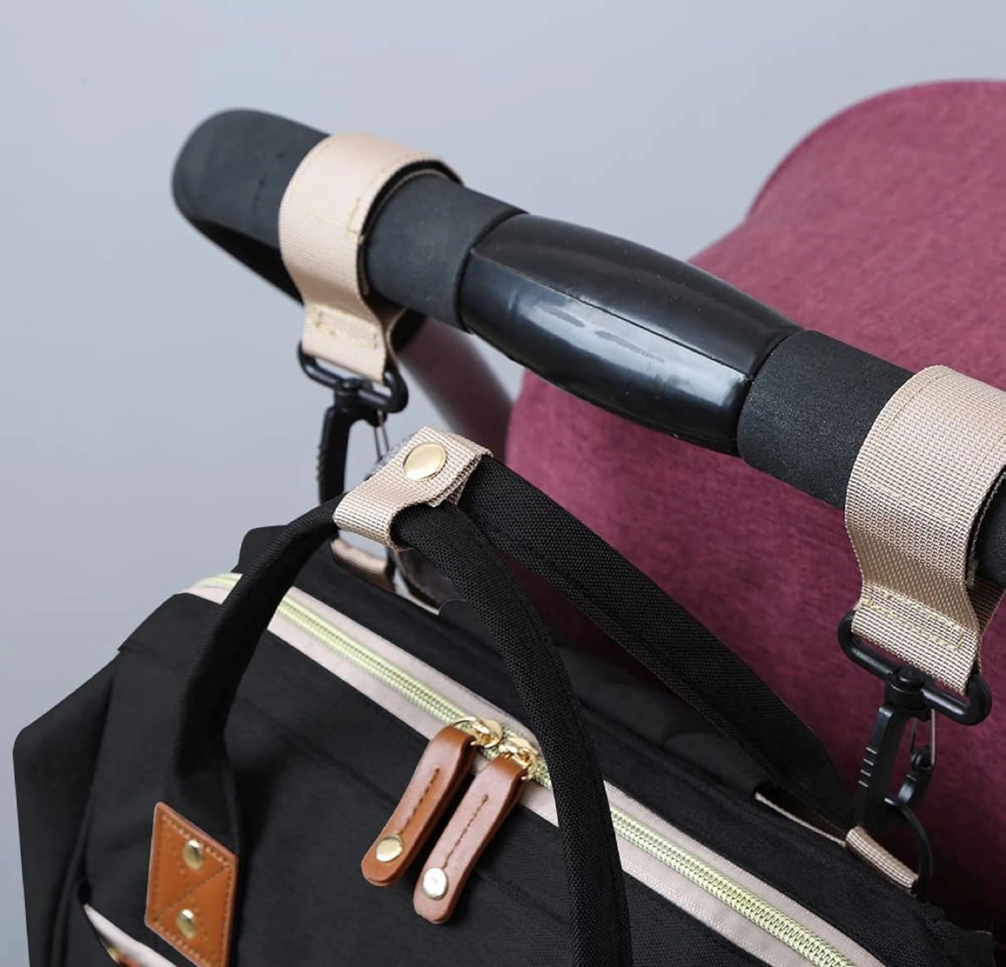 Large capacity diaper bag backpack. Multiple compartments and pockets. Includes USB charging port. Stroller straps. Beige accents.