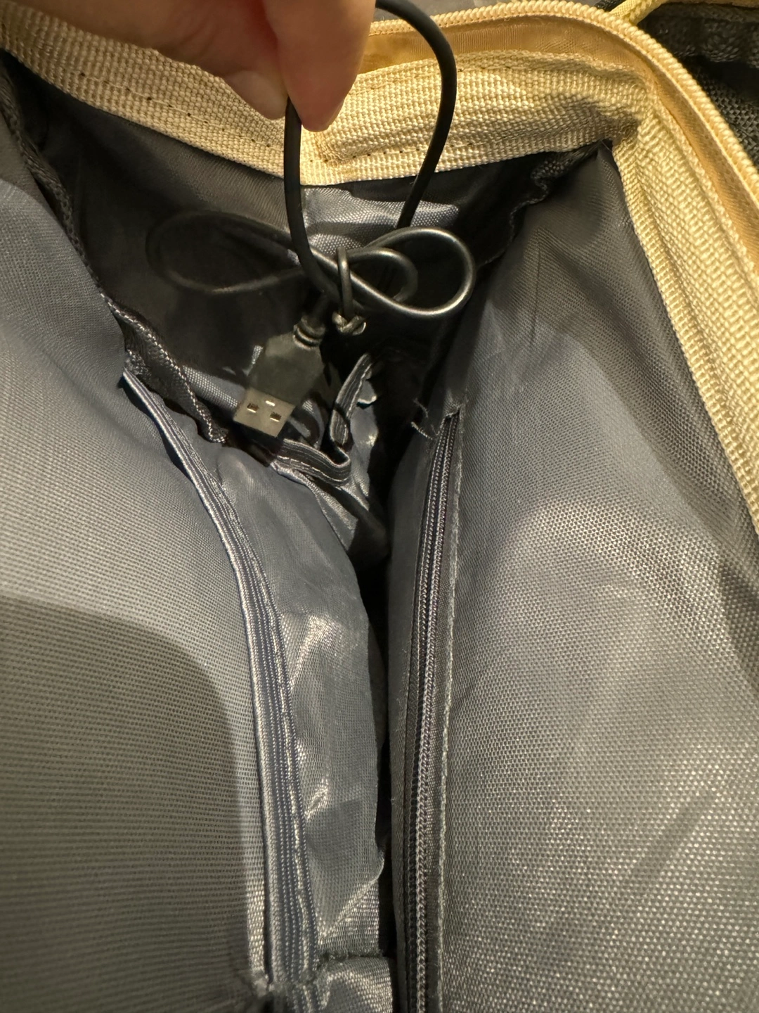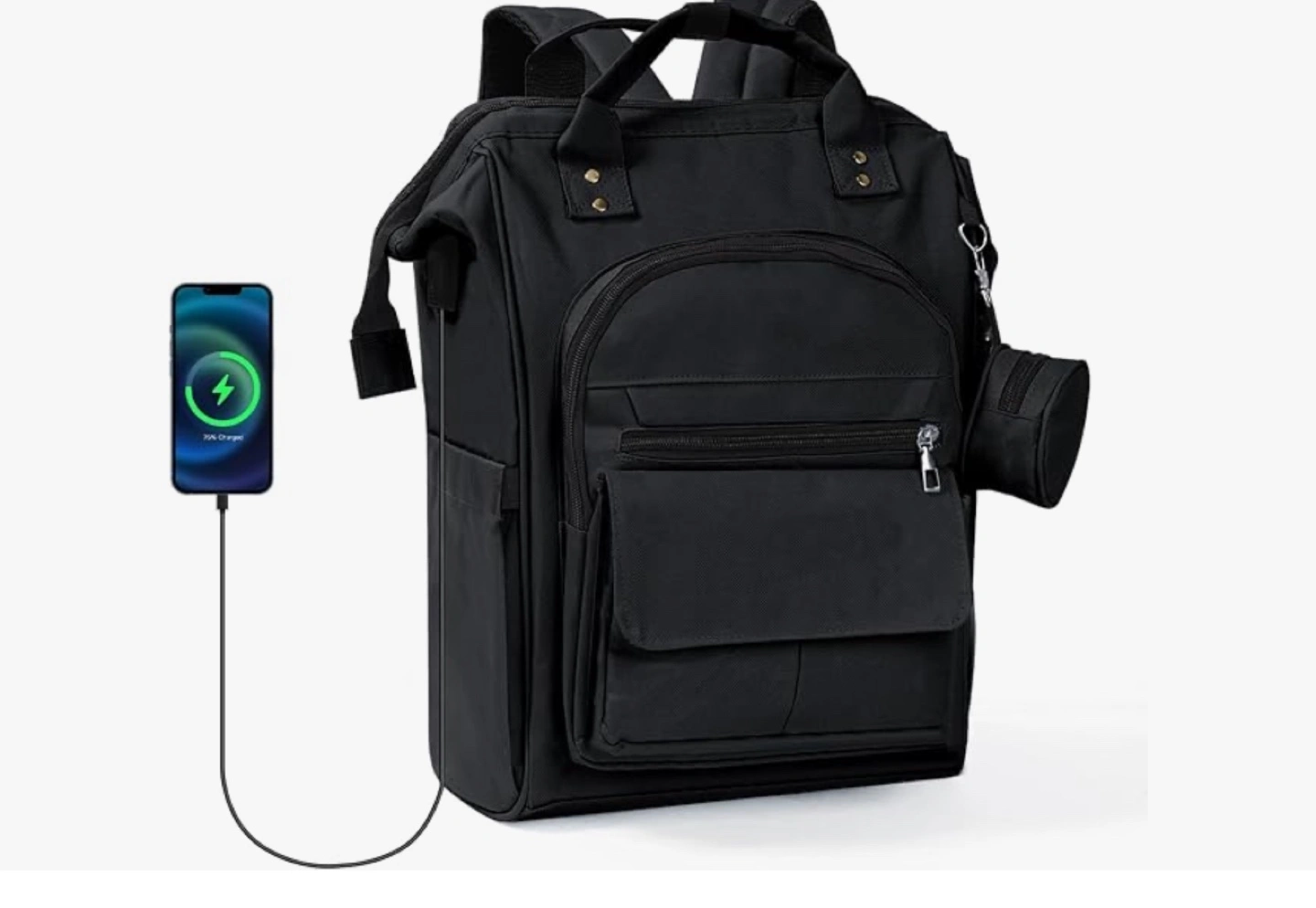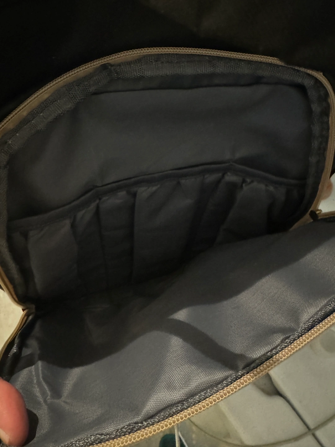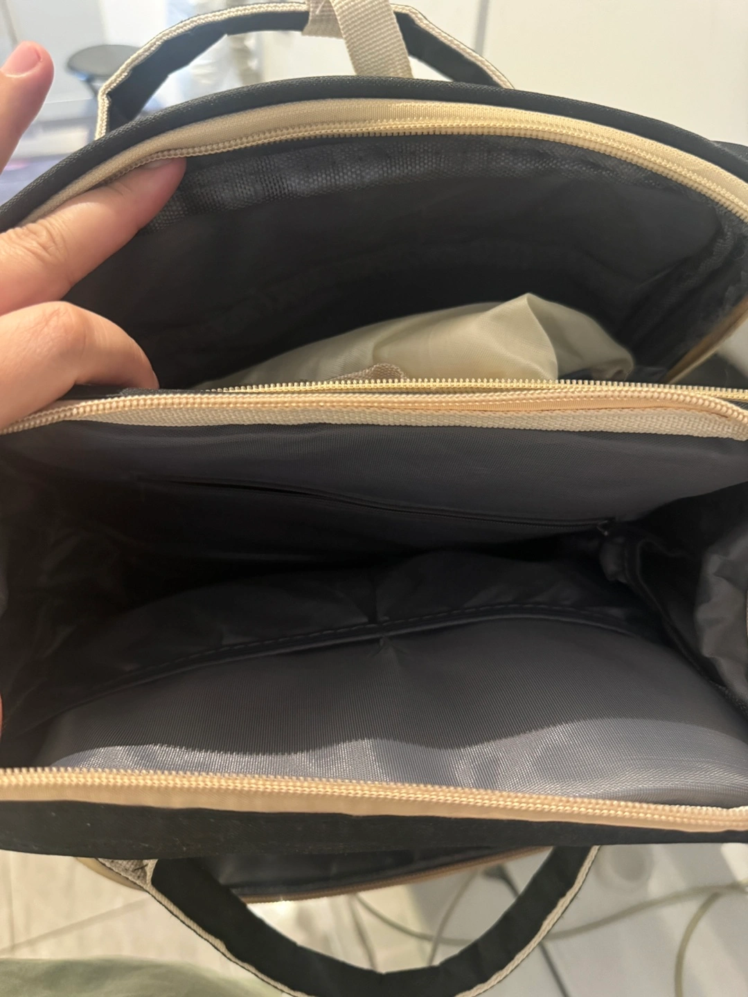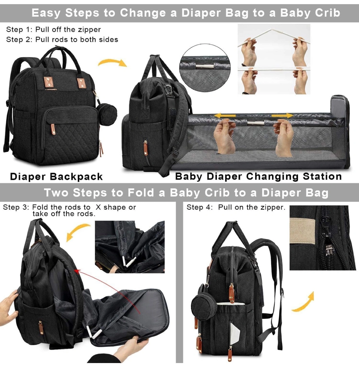 Large capacity diaper bag backpack. Multiple compartments and pockets. Includes USB charging port. Stroller straps. Beige accents.