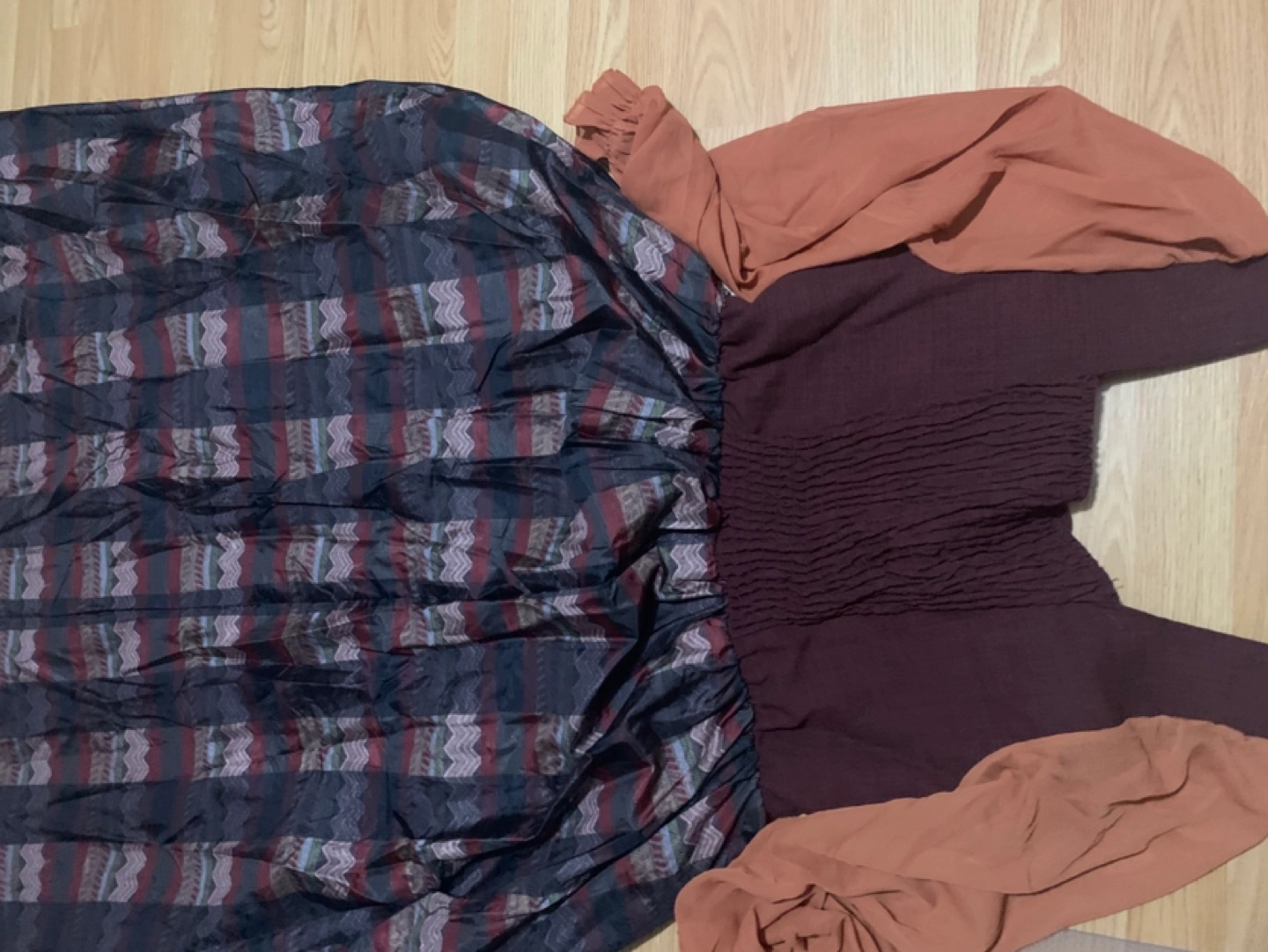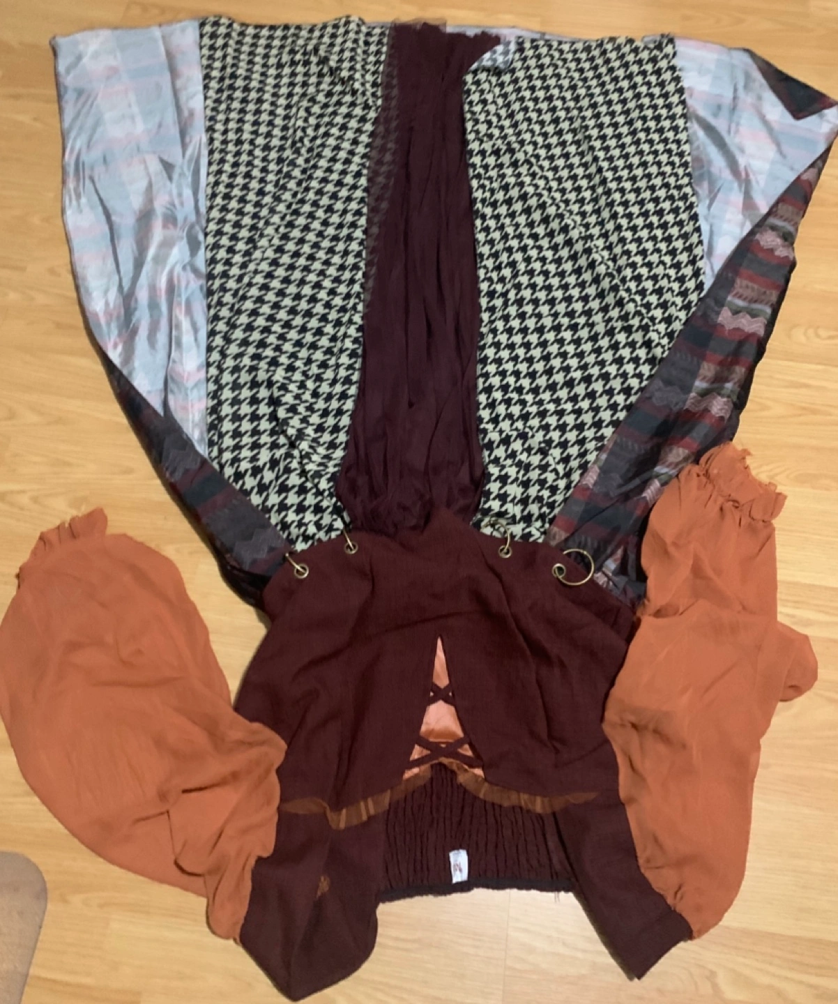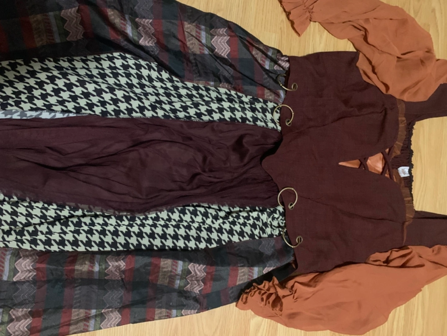 Stunning maxi dress. Features a maroon bodice with a unique V-neckline and orange-toned sleeves. The skirt is a patchwork of various fabrics and patterns. Eye-catching and stylish. Brand new