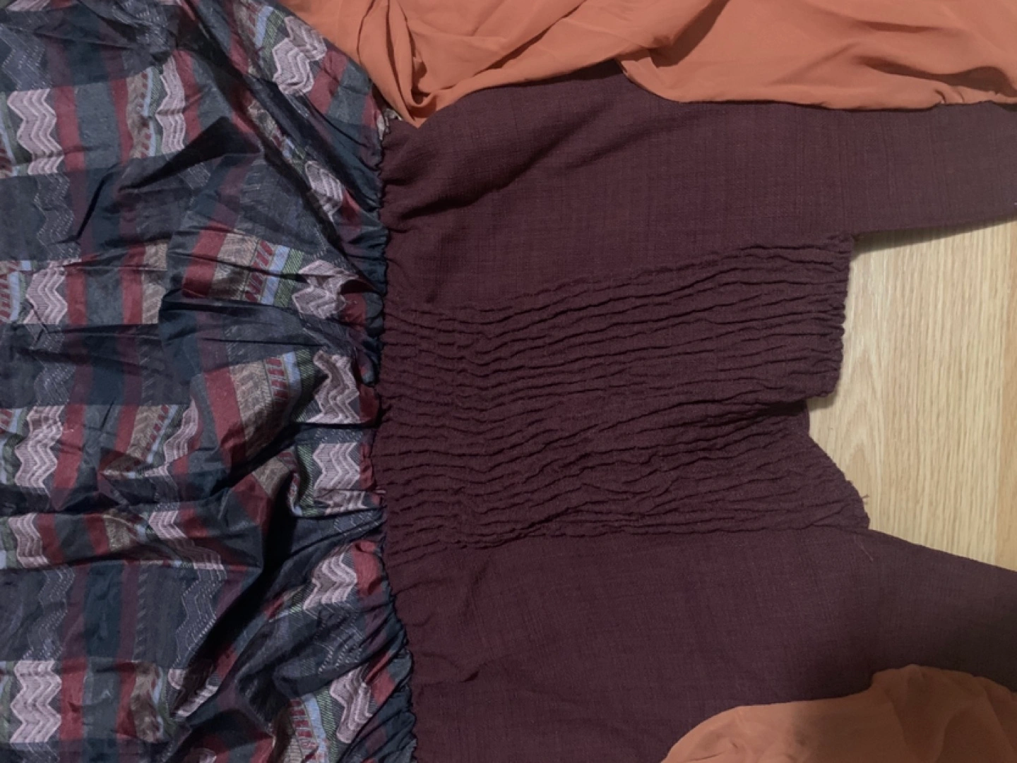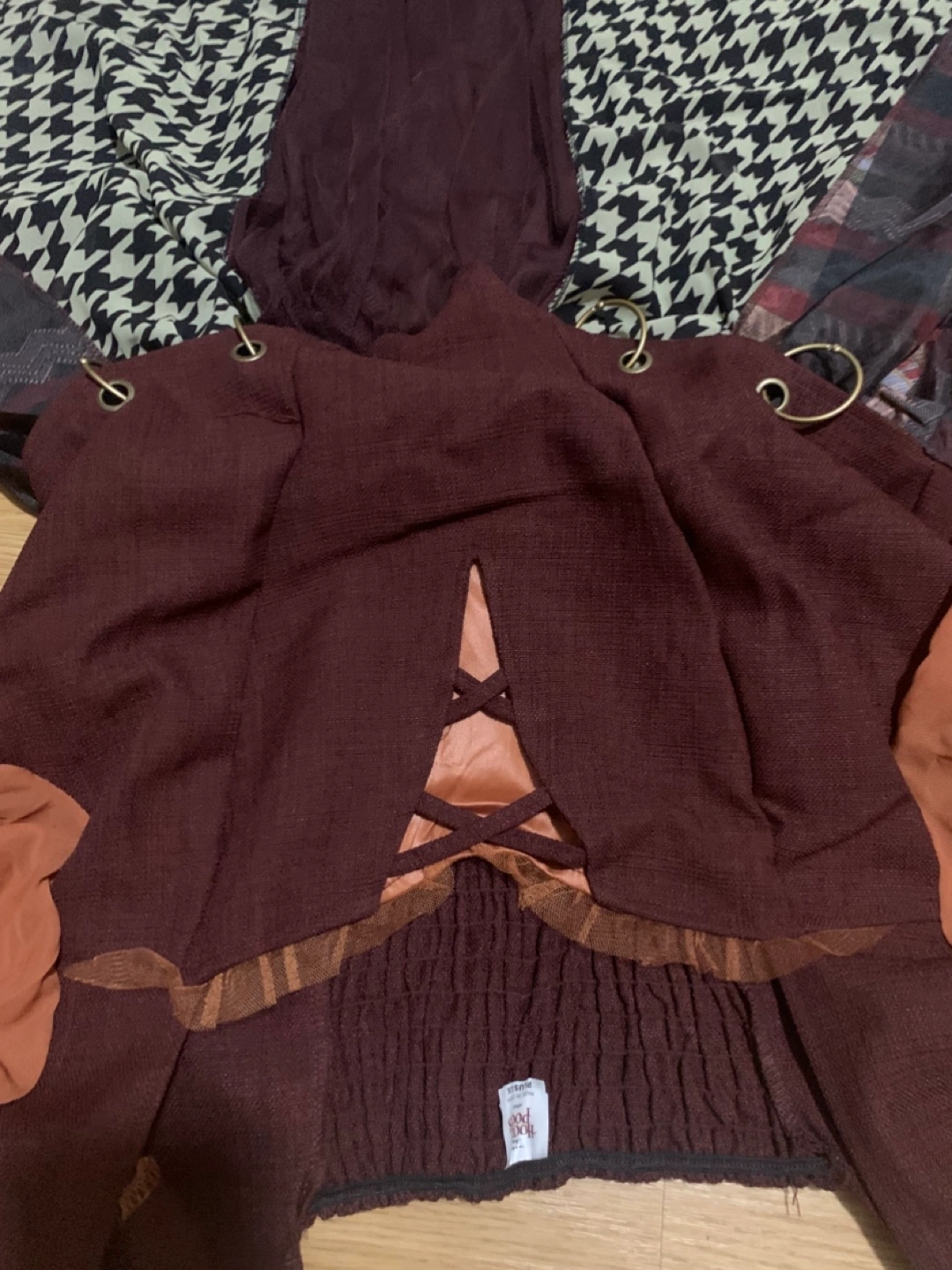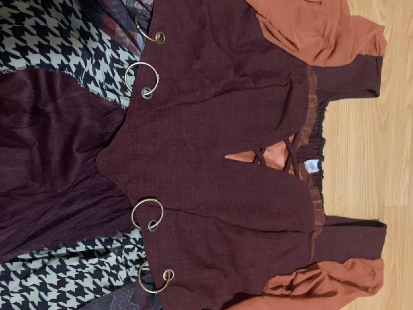 Stunning maxi dress. Features a maroon bodice with a unique V-neckline and orange-toned sleeves. The skirt is a patchwork of various fabrics and patterns. Eye-catching and stylish. Brand new