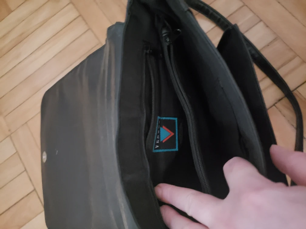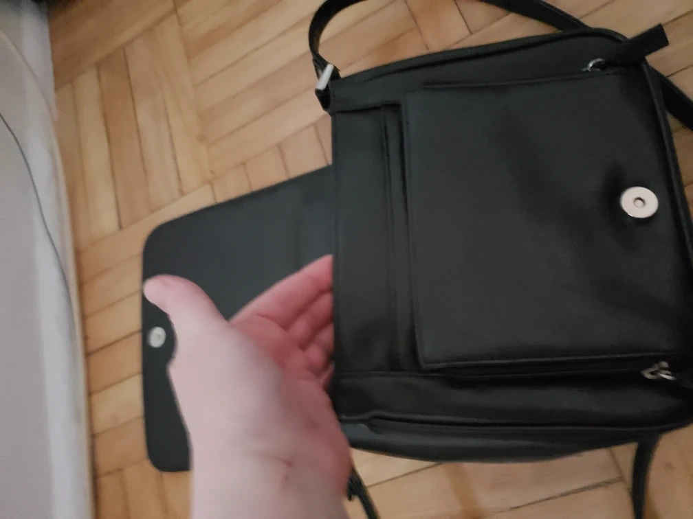 Small black leather shoulder bag. Features a zippered closure and an adjustable strap. Interior pocket. Pre-owned.