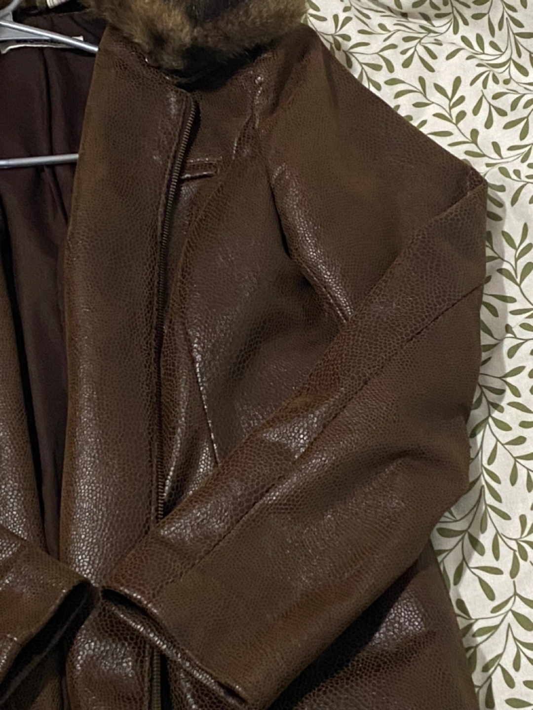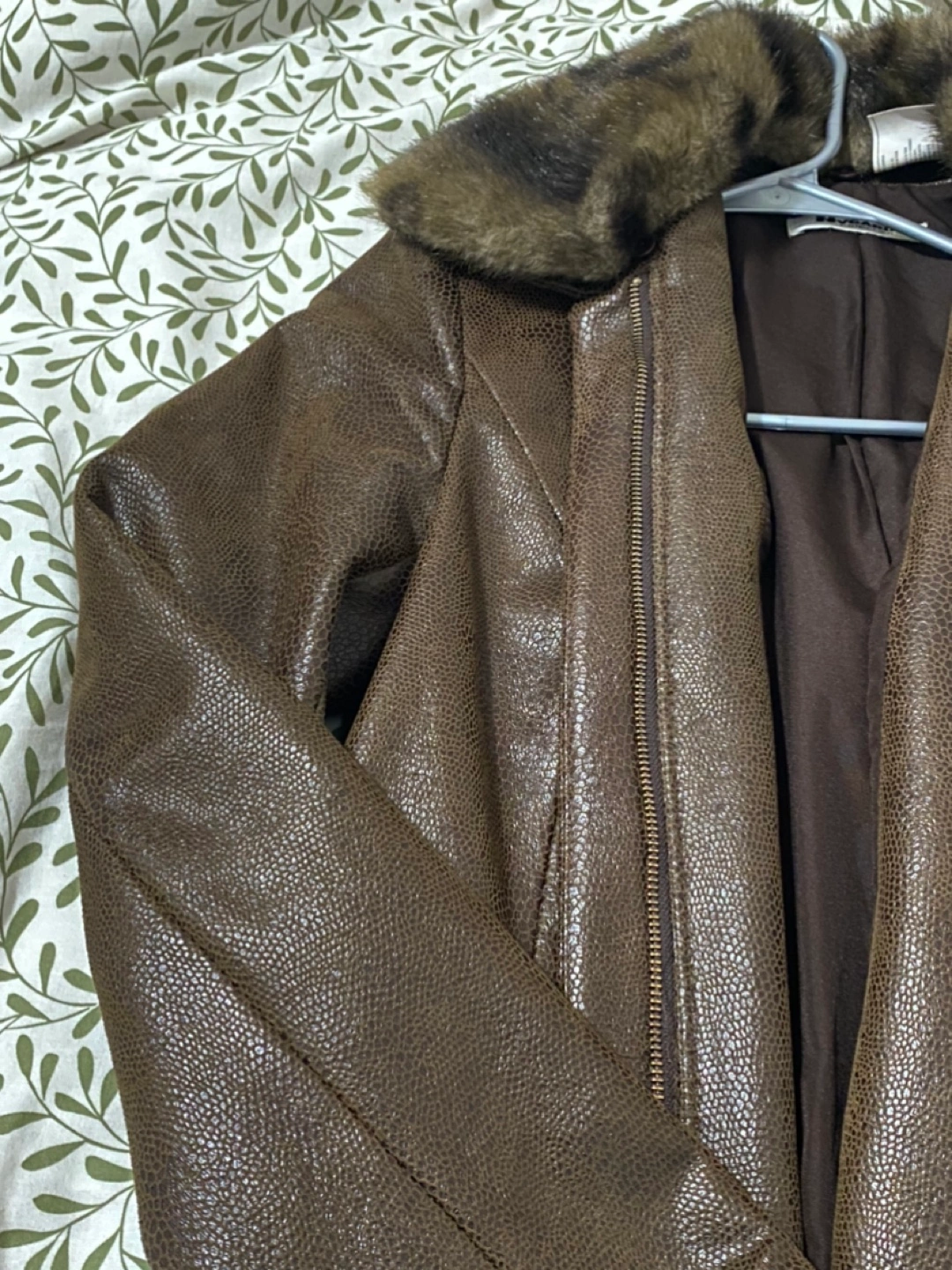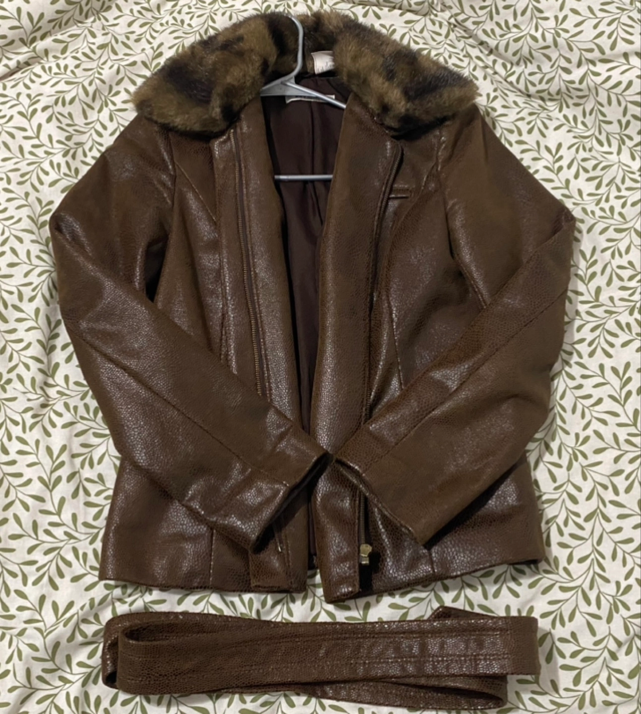 Women's brown faux leather jacket. Features a zip-up front, long sleeves, and a detachable faux fur collar. Includes a belt.