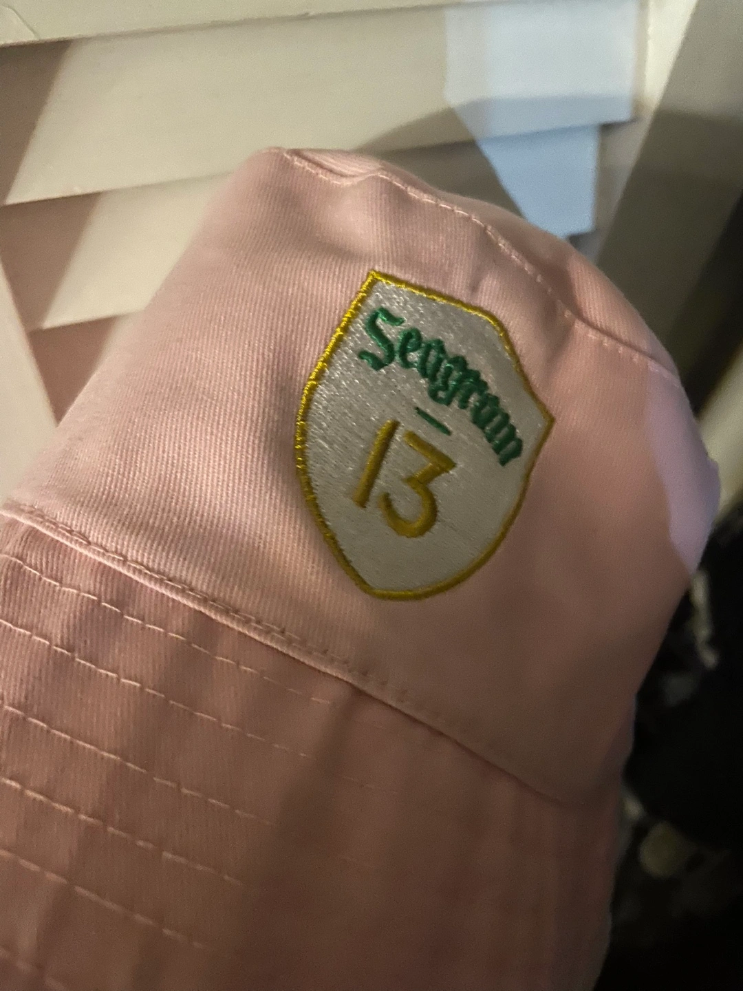 Pink bucket hat. Features an embroidered Seagram's 13 logo. Good condition.