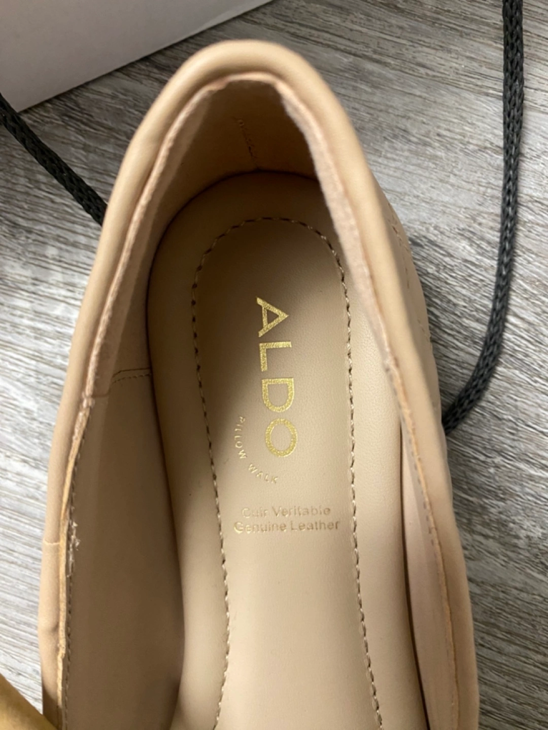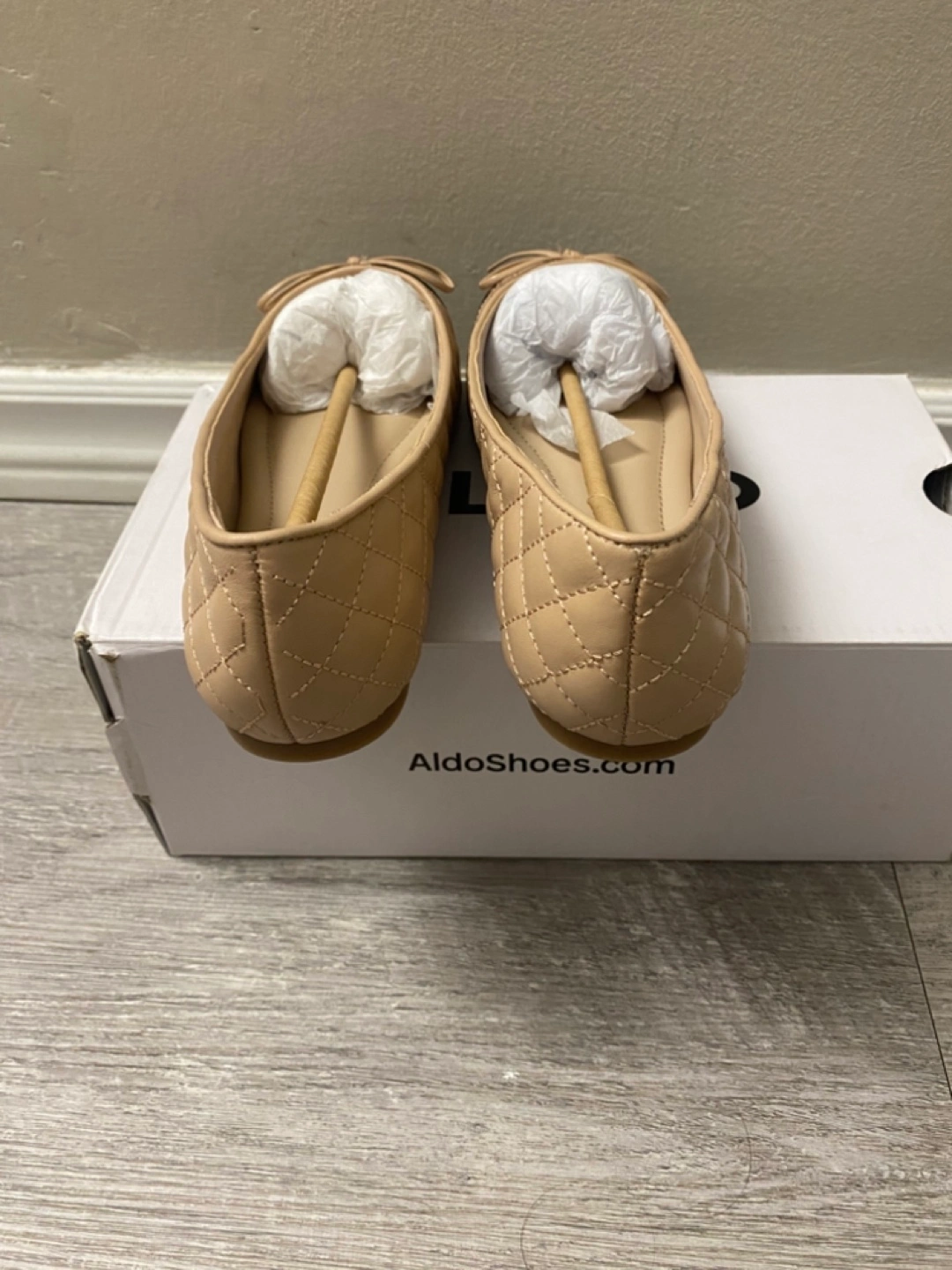 Brand new in box Aldo shoes for women Materials Size 7.5 Upper: Leather Main: Smooth Sole: Rubber Features Ballerina Closed snip toe Slip on Bow ornament Genuine Leather