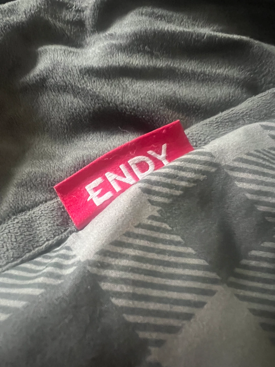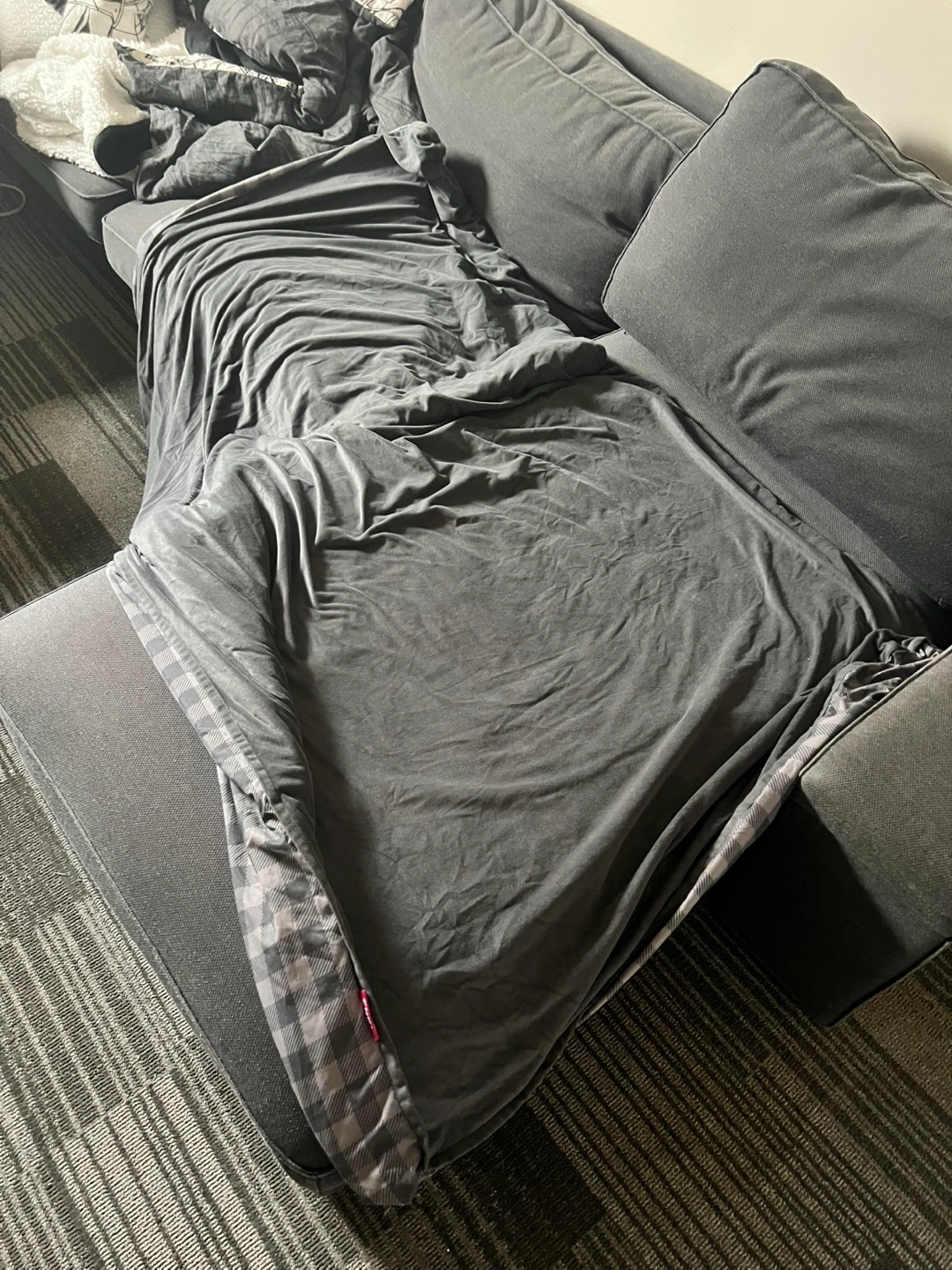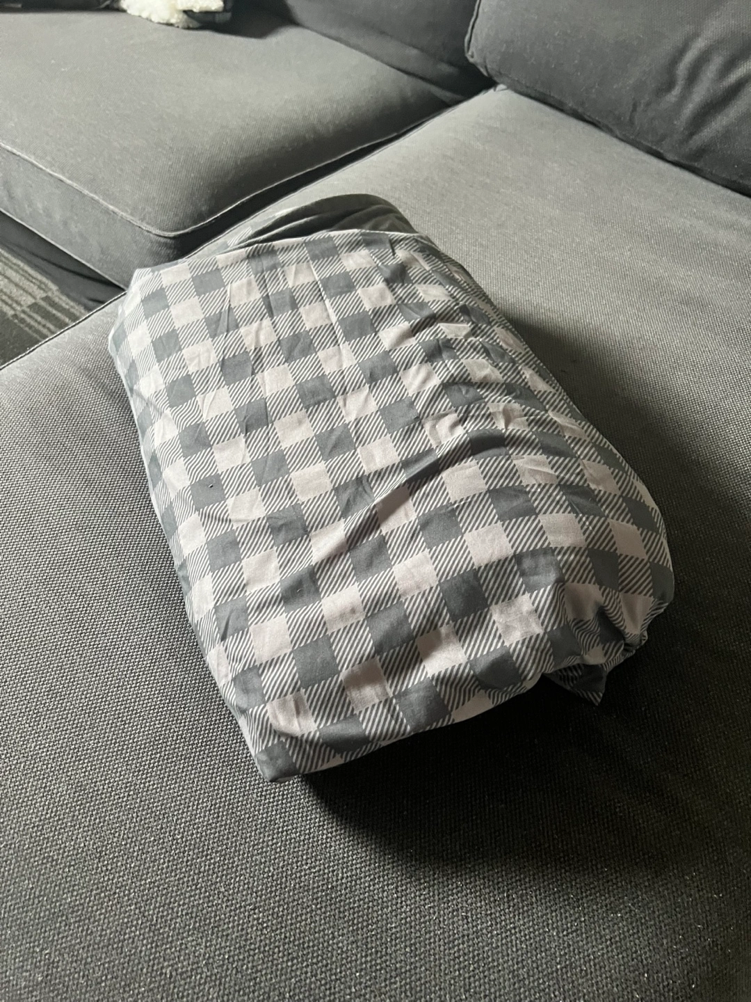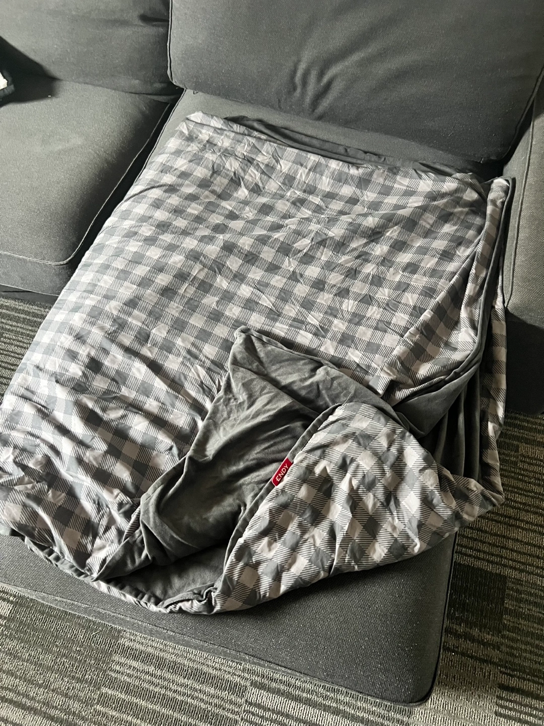 Cozy weighted blanket. Grey and white plaid pattern. Soft and comfortable. Great for relaxing.