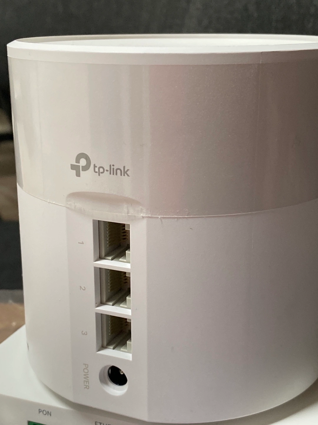 White cylindrical router. Three ethernet ports and power input. Good condition.