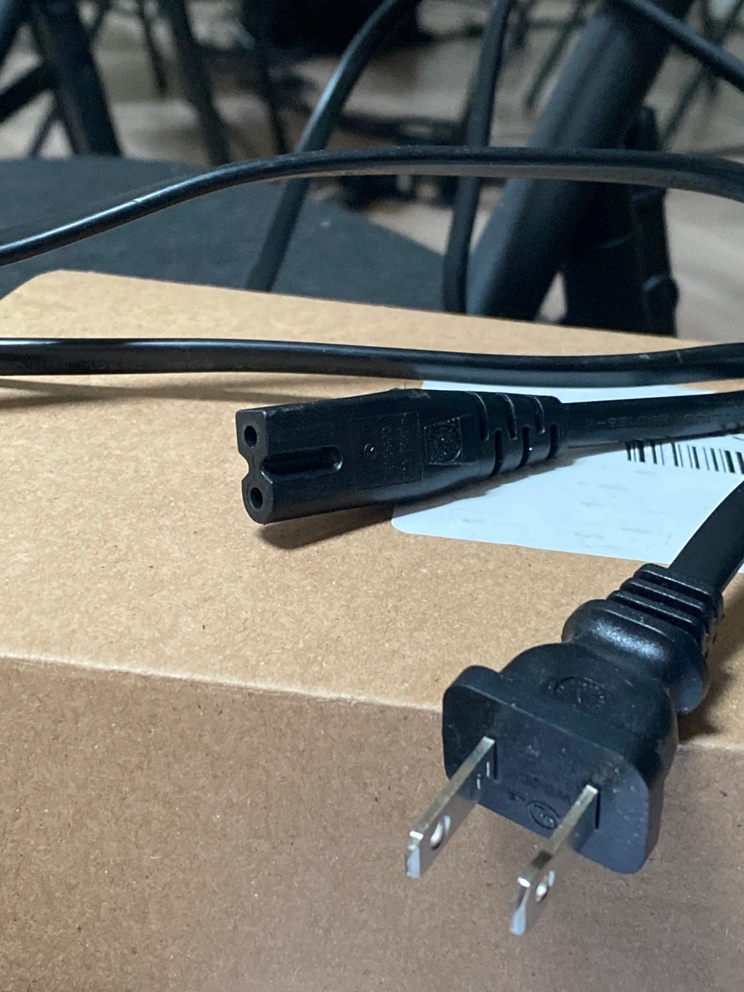 Black power cord. C7 connector on one end and NEMA 1-15P plug on the other. Used condition.