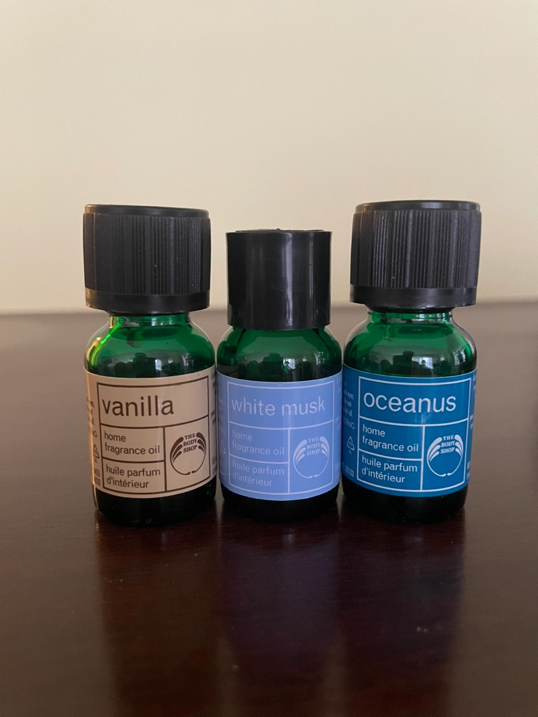 Three The Body Shop home fragrance oils. Vanilla, White Musk, and Oceanus scents. Small bottles, perfect for travel or a small space. All full up to top of label All 3 for $5