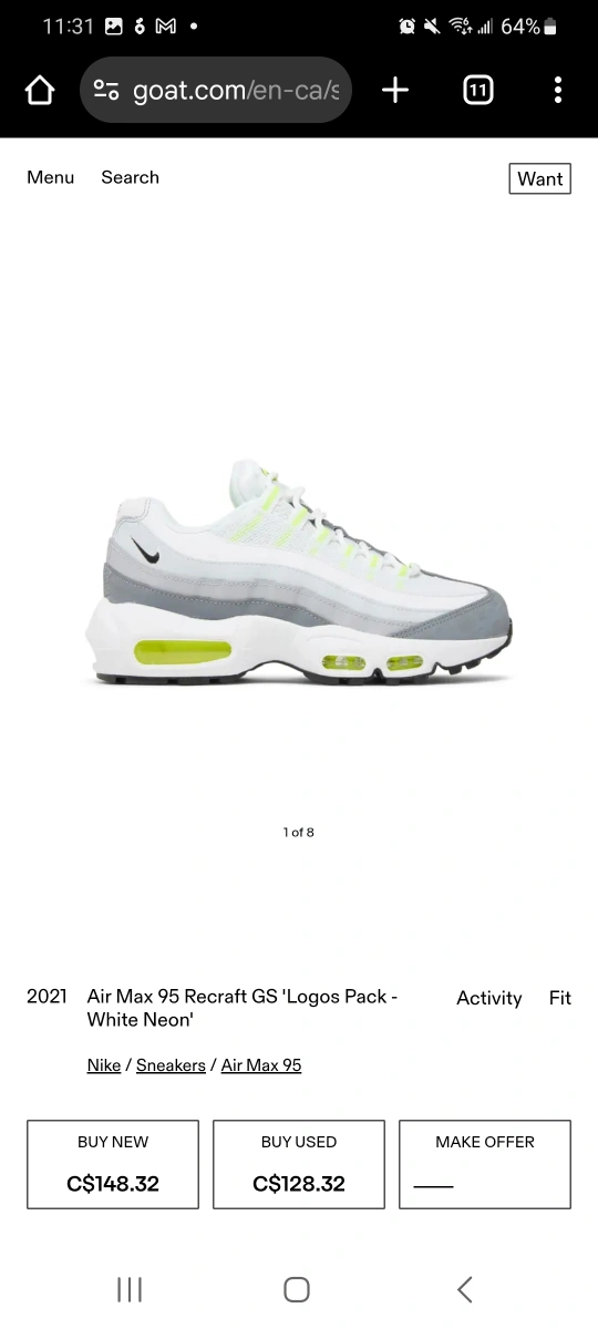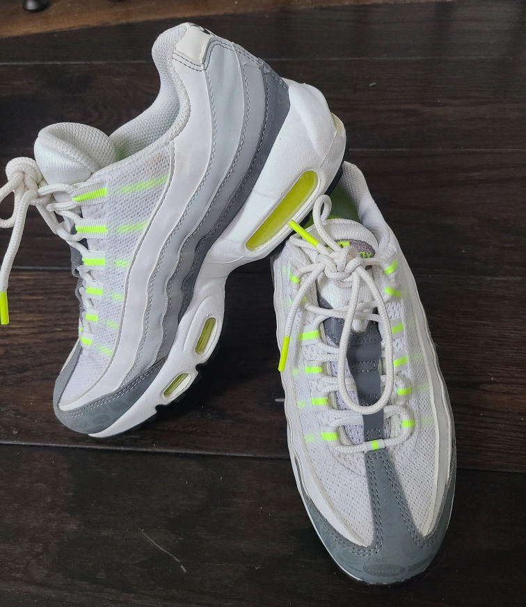 Like New White and grey Air Max 95 running shoes size 4.5Y or 6 in women's. Neon yellow accents. Pre-owned. If ad is up this is still available. regular $148+. cash and pick up only.