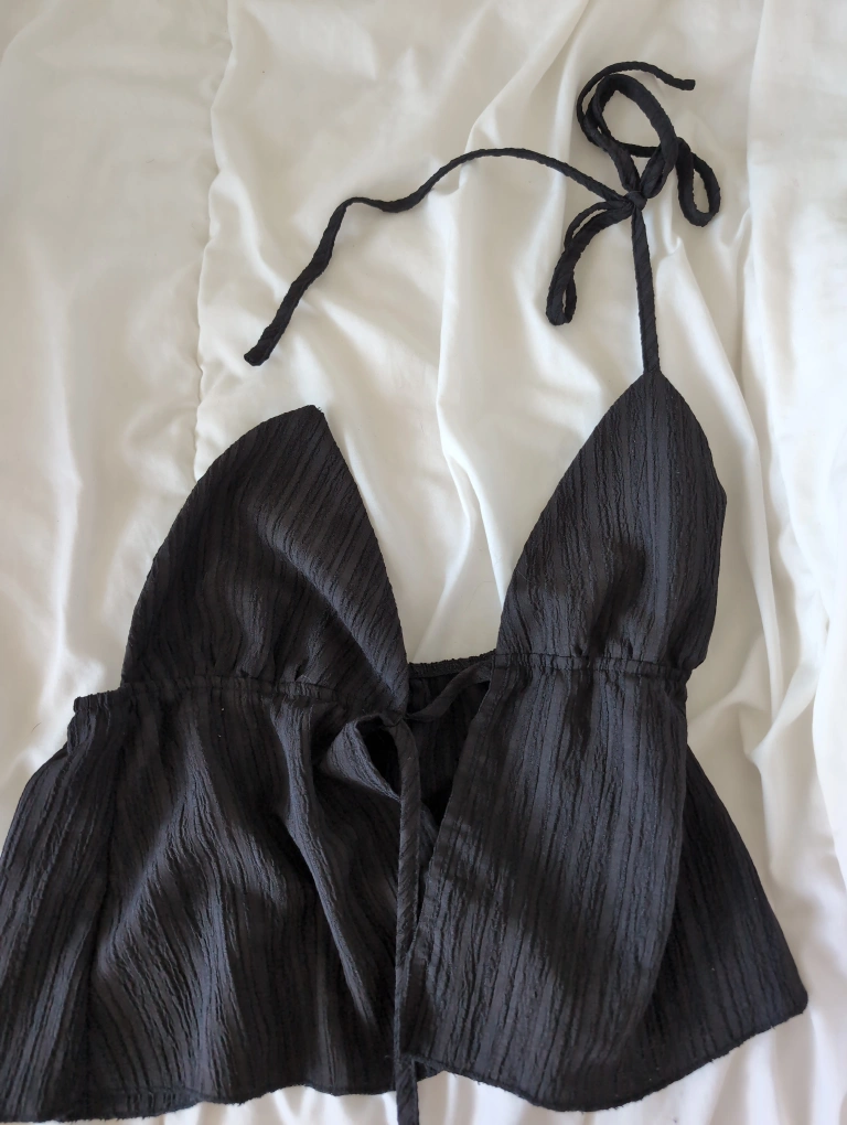 Black cropped halter top, size small. Features a textured fabric and tie front. Lightweight material. The top strap needs to be sewn onto the front part to make it a halter top, but if you know how to sew, this would be an easy fix! 🙂