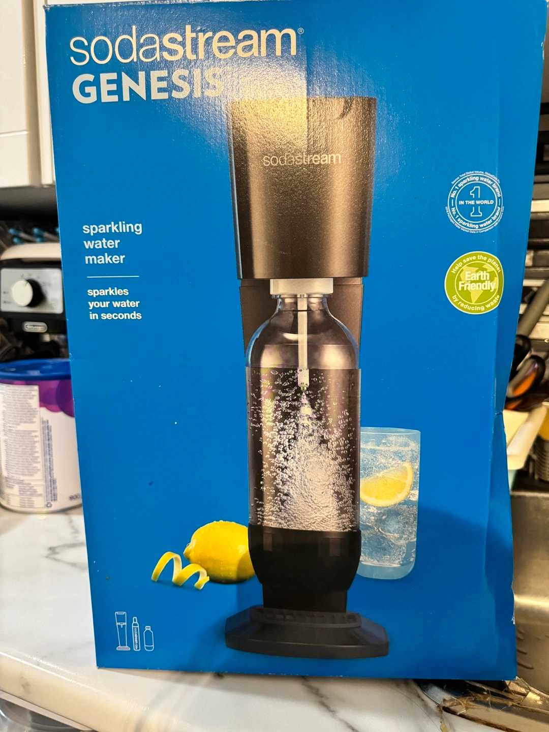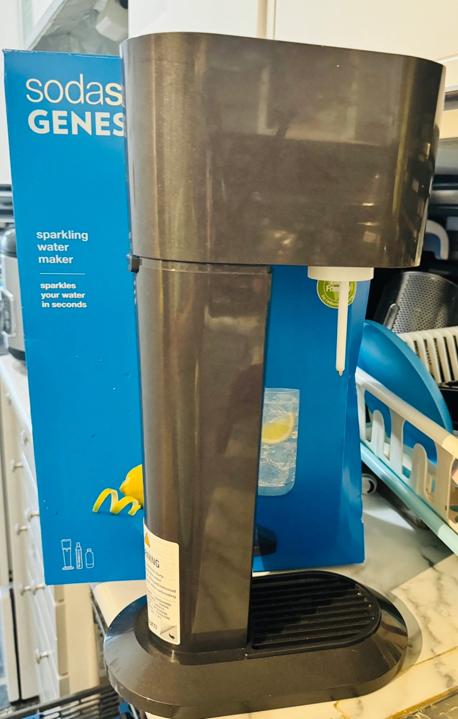 SodaStream Genesis sparkling water maker. Dark grey colour. Makes sparkling water in seconds. Includes CO2 canister.