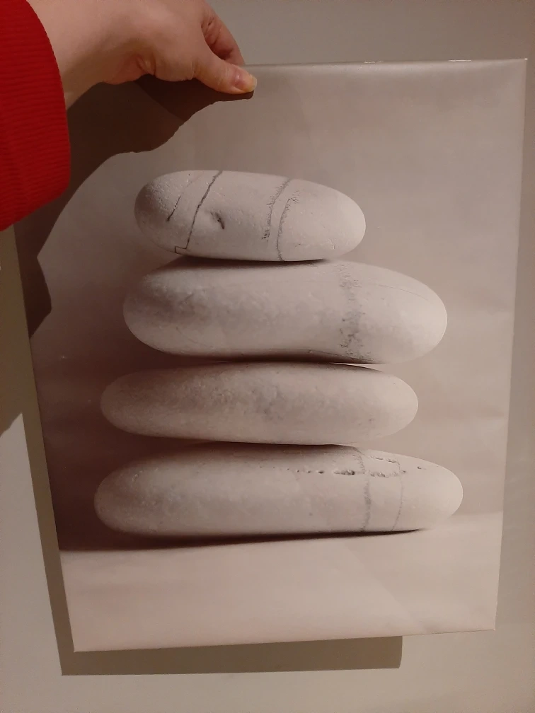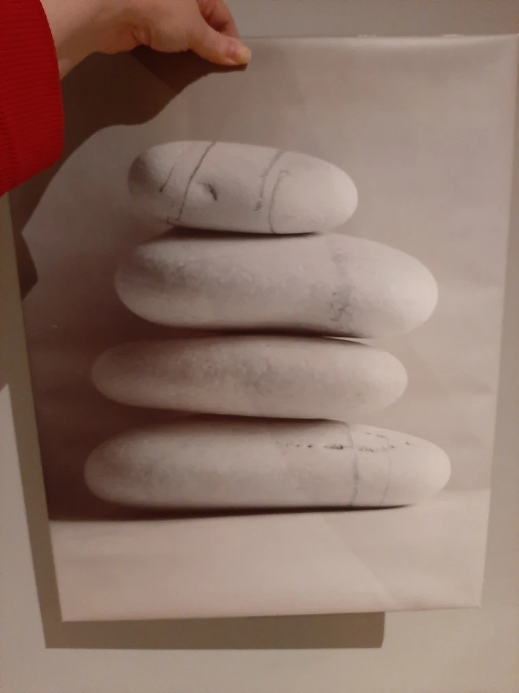 Beautiful canvas print. Features a minimalist design of stacked stones. Great for adding a calming touch to any room. Neutral colours. 19 1/4 inches x 15.5 inches. Some wear on corners so discounted. Paper material. From IKEA. Pick up Scarborough