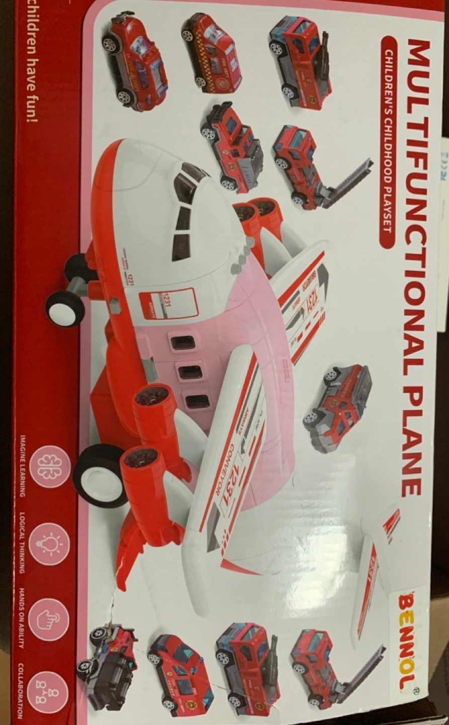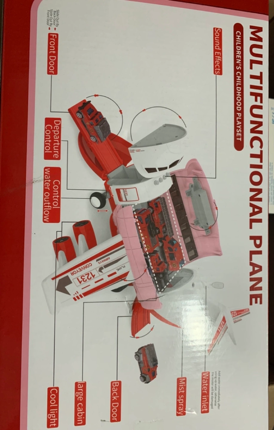Children's toy airplane playset. Features multiple fire trucks, sound effects, and water outflow. Large cabin, cool light, and mist spray. Great for imaginative play. Brand new