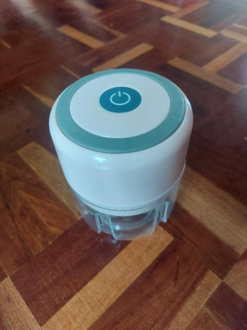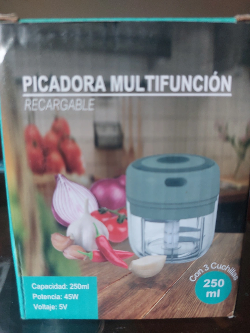 Portable and convenient food chopper. Rechargeable, 250ml capacity. Includes three blades. Perfect for chopping herbs, garlic, and more.