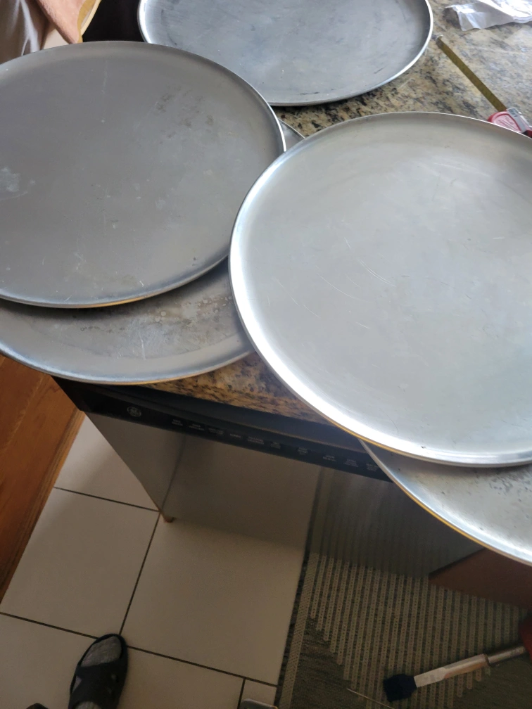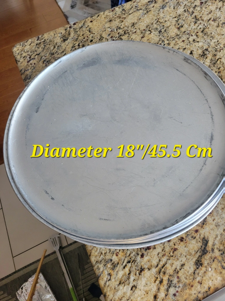 Set of five used aluminum pizza pans. Good for home or commercial use. Shows signs of use. Diameter 18 inches / 45.5 centimetres. Each $10