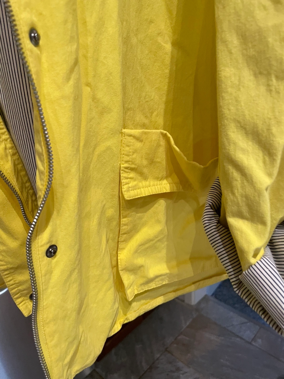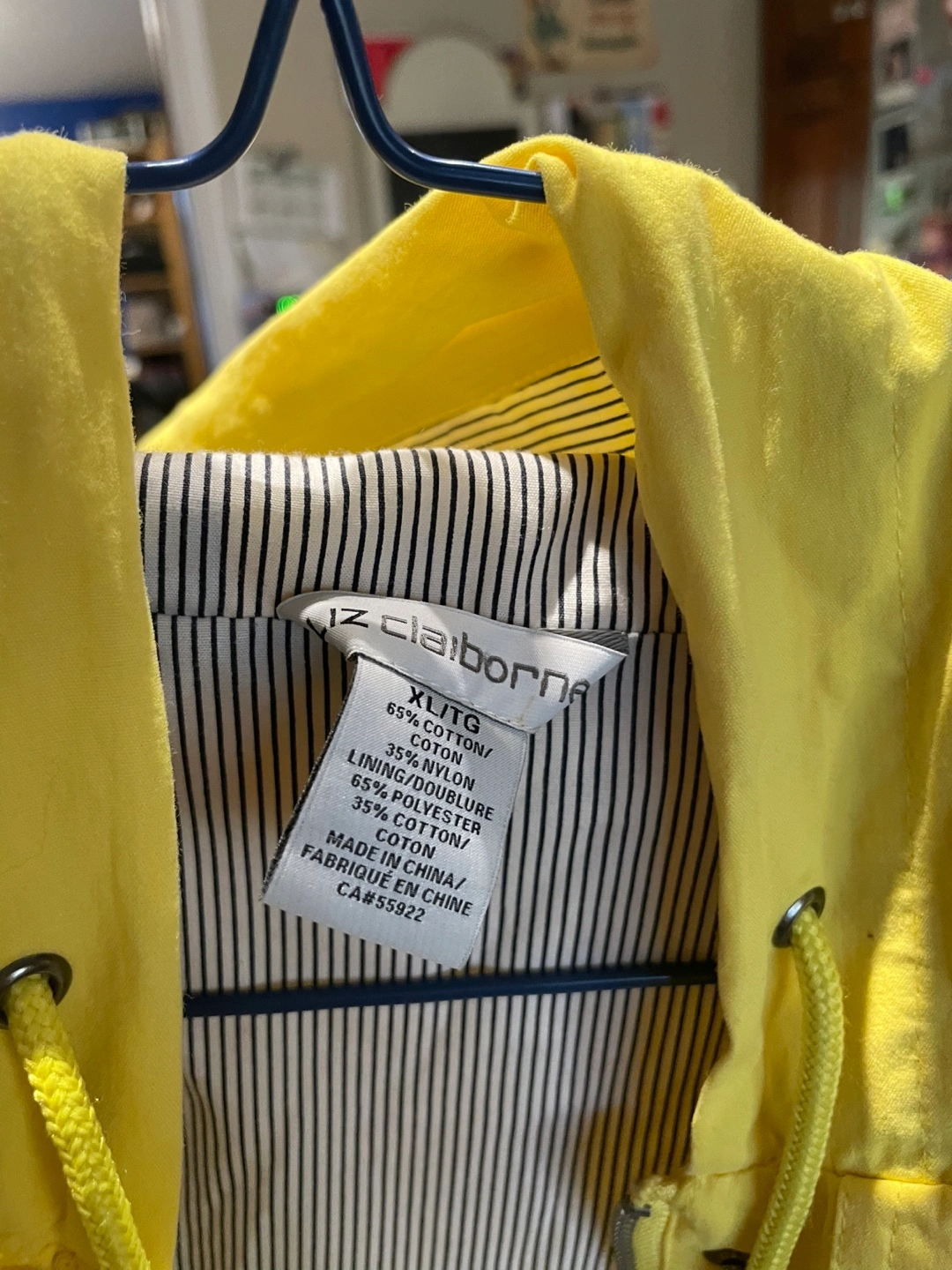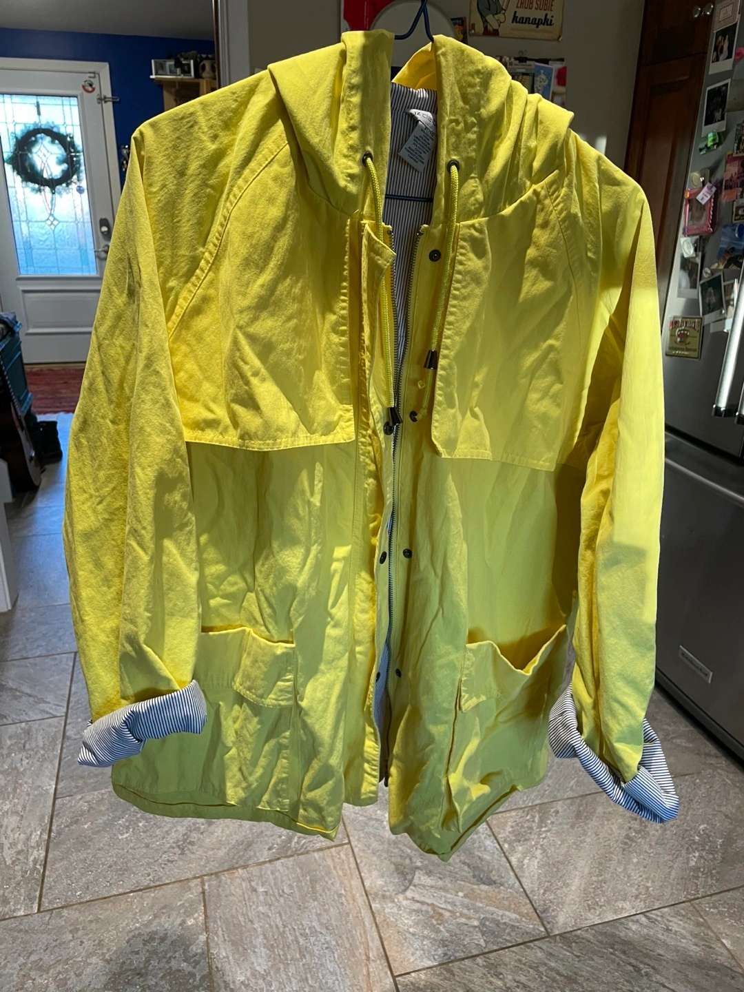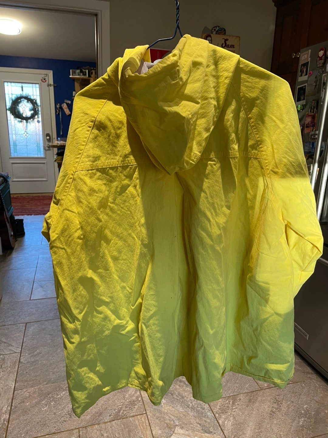 Lightweight yellow hooded jacket. Features pockets and a zip closure. Striped inner lining. Size XL.