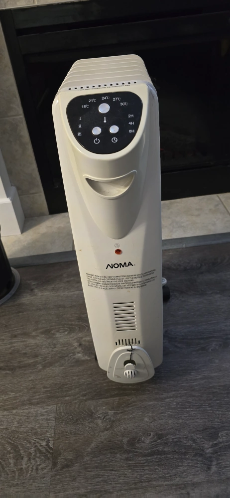 Used NOMA oil-filled radiator heater. White. Features adjustable thermostat and timer. Good for smaller spaces. Shows some wear.