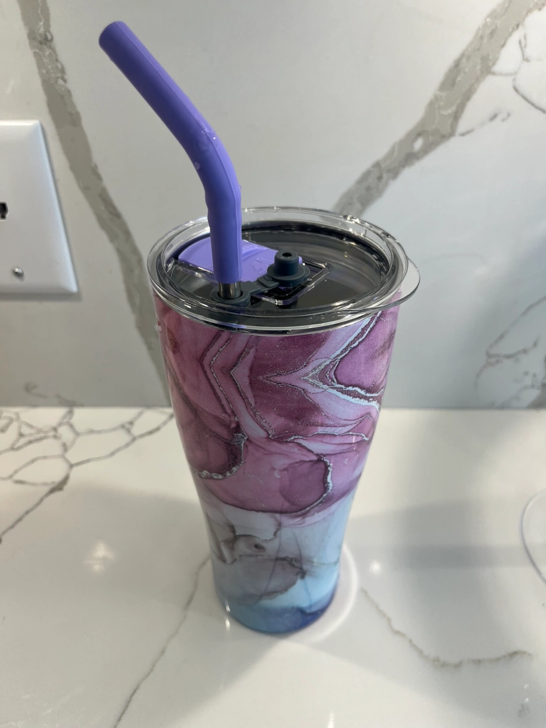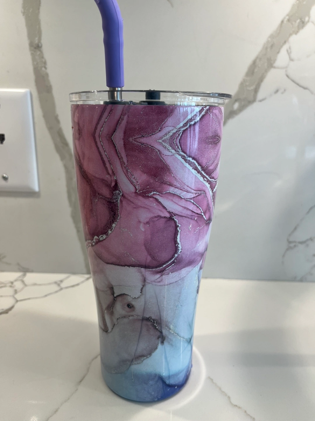 Reusable tumbler. Features a beautiful marble design in shades of pink and blue. Includes a reusable straw. Great for coffee, tea, or other beverages. Keeps drinks cold or hot.
