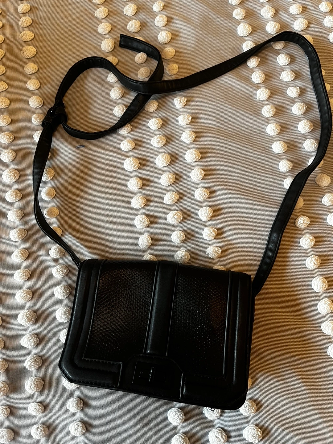 Small black crossbody bag. Features a flap closure and adjustable strap. Faux leather material.