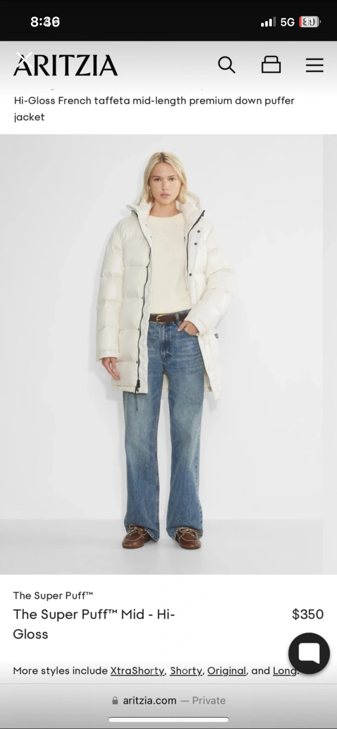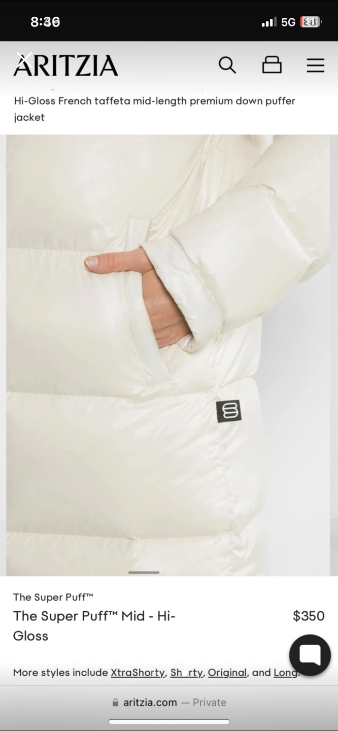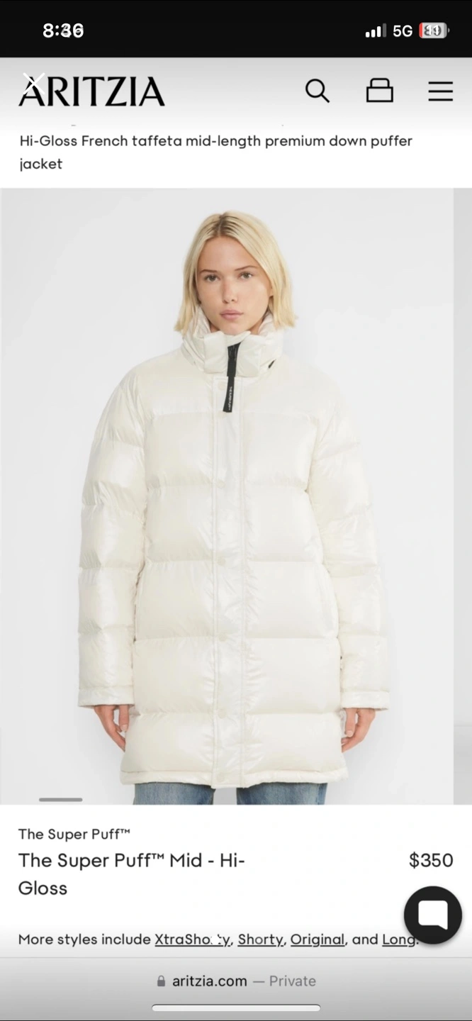 Aritzia Super Puff™ mid-length down puffer jacket. Hi-Gloss French taffeta. Premium quality. White colour. Waterproof. Excellent condition. Size is 3xs but oversized, will fit small.
