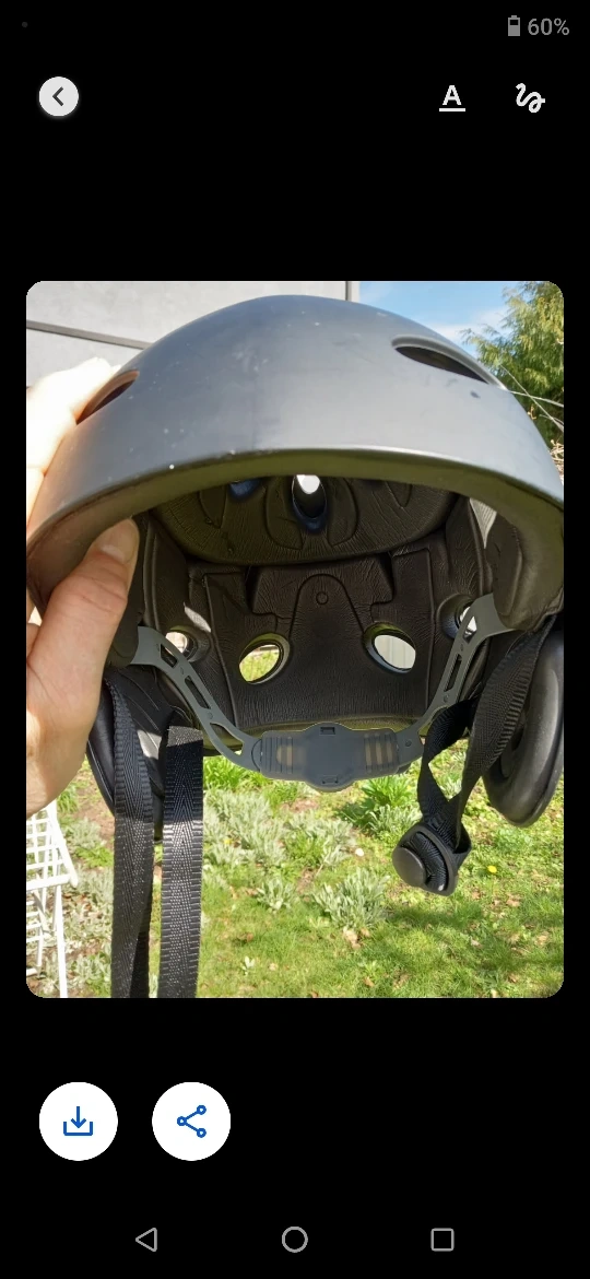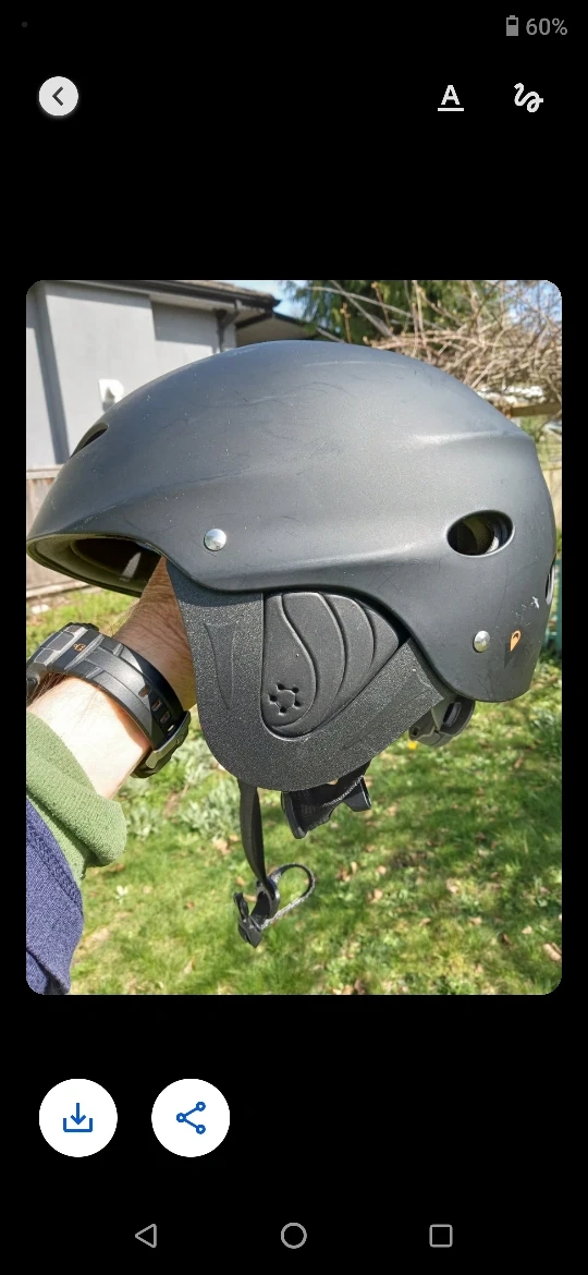 Used black watersports helmet. Adjustable straps. Good condition. Perfect for kayaking, canoeing, or other water activities.