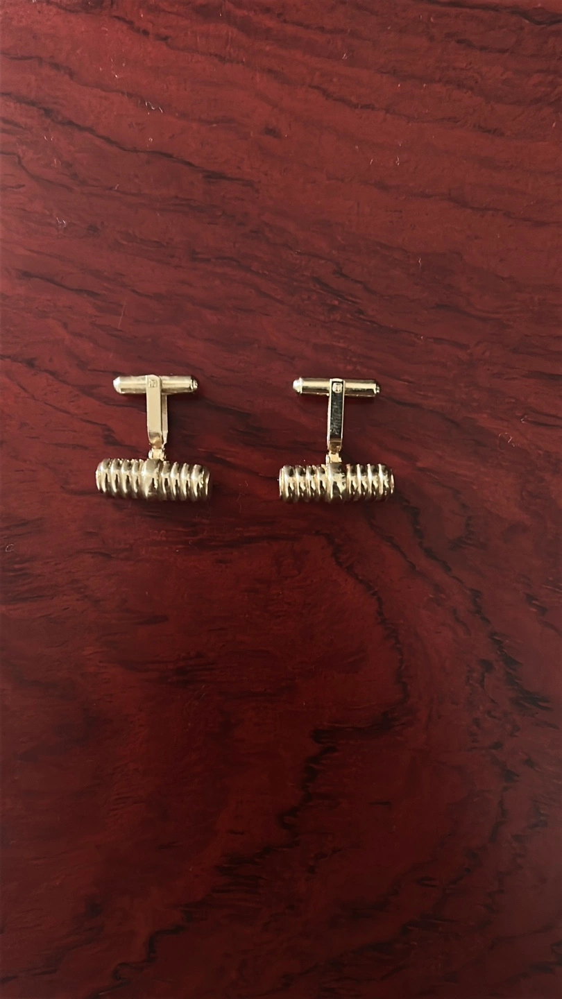 Pair of gold tone cufflinks. Unique ribbed design. Stylish accessory.