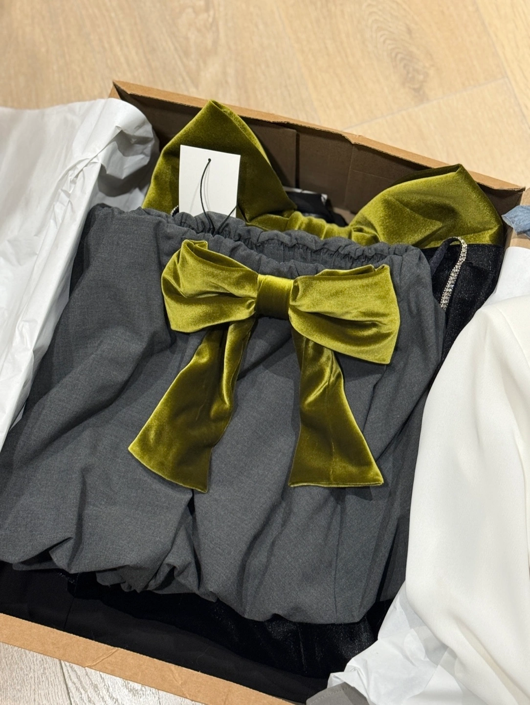 Stylish grey featuring a large olive green velvet bow. Perfect for a night out. DT pickup only!