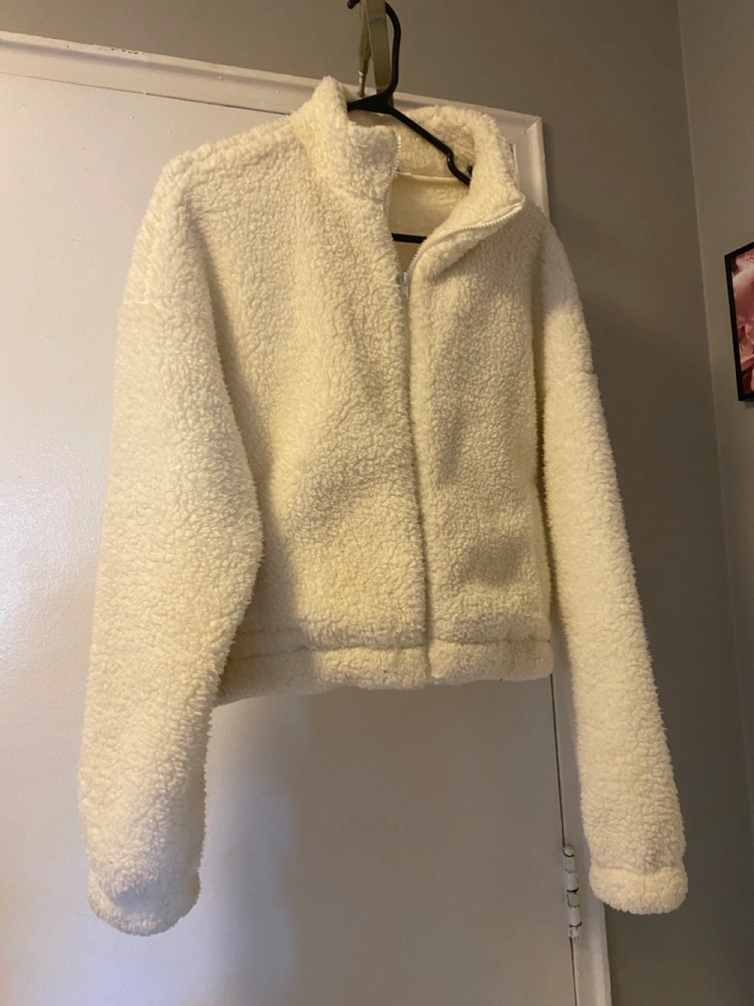 Cream-coloured zip-up jacket. Size Medium. Soft, fluffy material. Long sleeves.