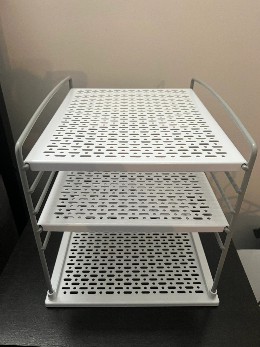 Three-tiered shelf organizer. White plastic shelves with grey metal frame. Great for organizing pantries, cupboards, or desks. Lightweight and easy to assemble.