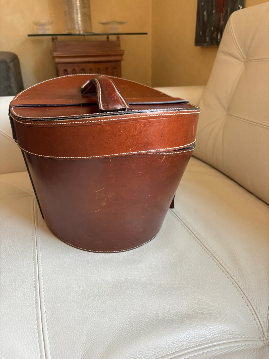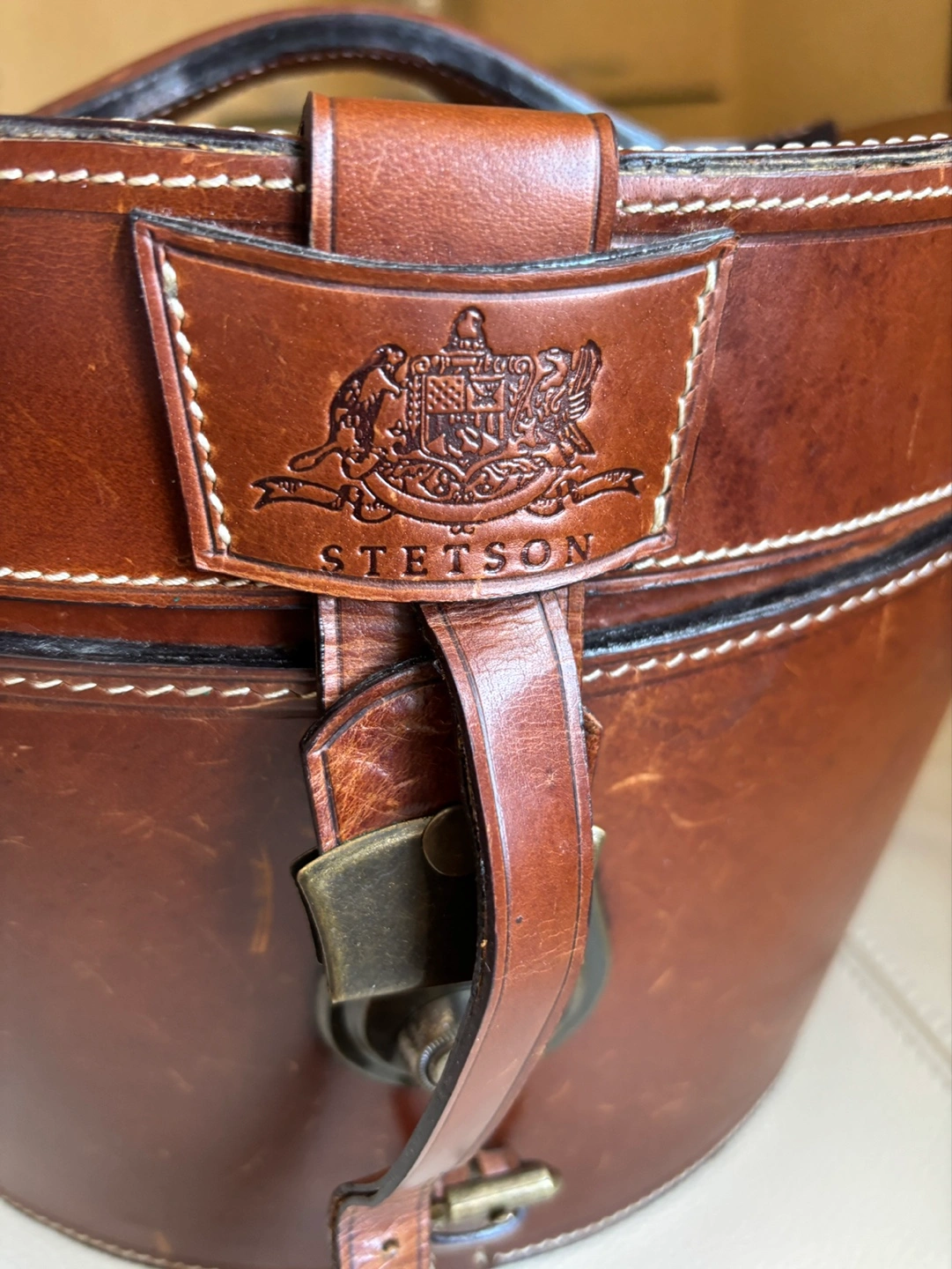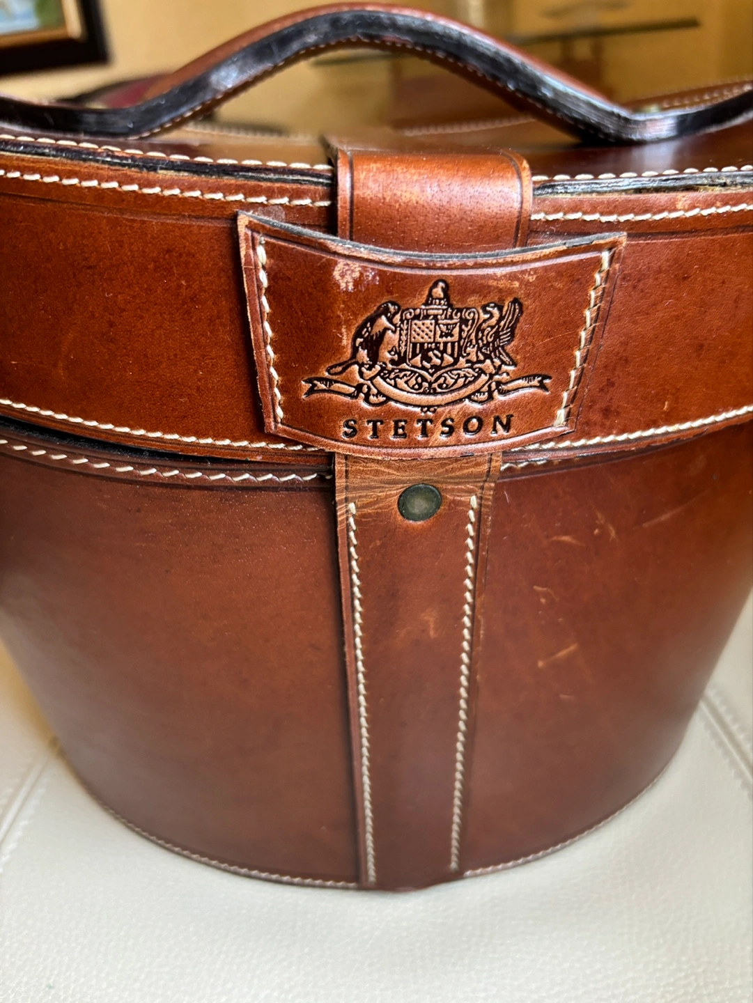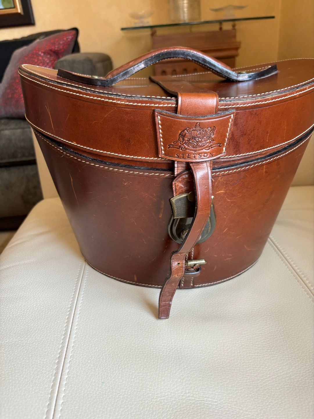 Brown leather Stetson brand hat box. Features a carrying handle and clasp closure. Shows some signs of wear consistent with age. 13 1/4 inches across, 11 inches wide with a depth of inches. Made in India and in fantastic condition. No key for lock. From a pet and smoke free home. Cash only. Pickup in the St Lawrence market area of downtown Toronto.