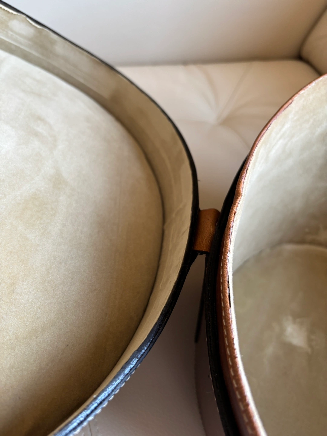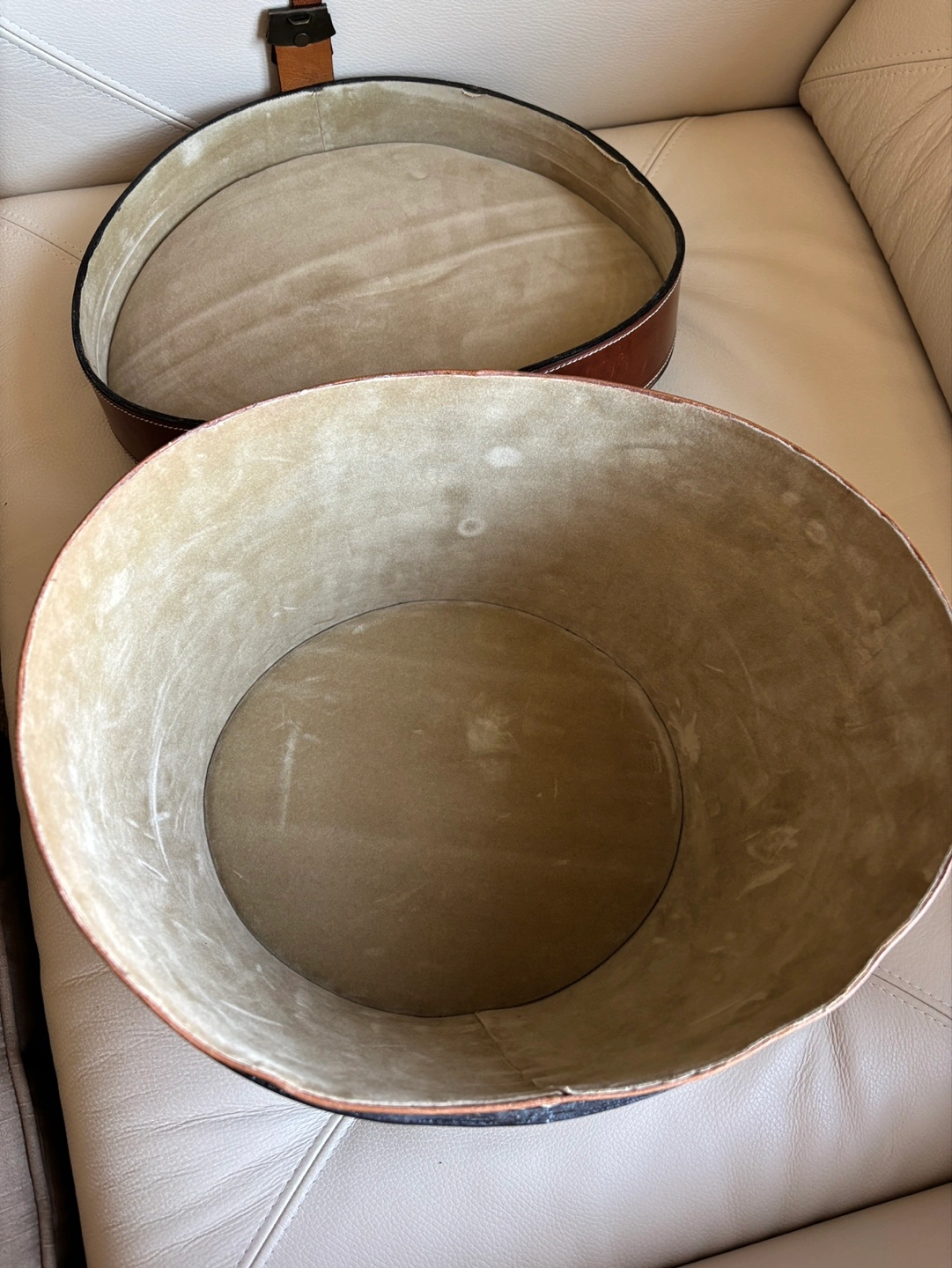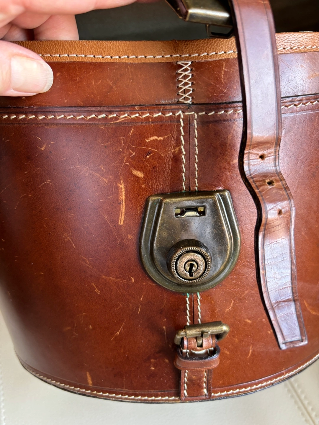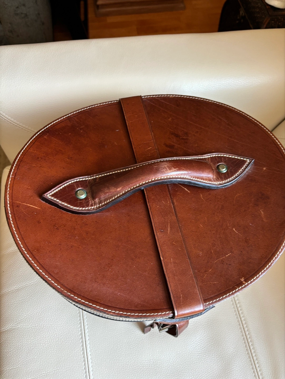 Brown leather Stetson brand hat box. Features a carrying handle and clasp closure. Shows some signs of wear consistent with age. 13 1/4 inches across, 11 inches wide with a depth of inches. Made in India and in fantastic condition. No key for lock. From a pet and smoke free home. Cash only. Pickup in the St Lawrence market area of downtown Toronto.