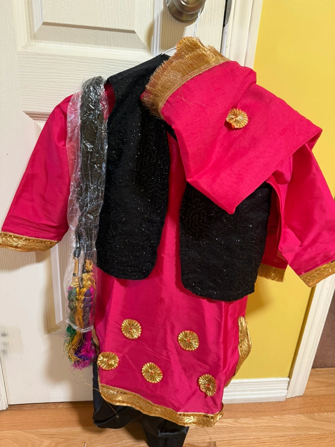 Beautiful kids Bhangra outfit. Includes kurta, churidar, waistcoat, dupatta, and headpiece. Pink and black colour scheme. Gold embellishments. Great for dance performances or special occasions.
