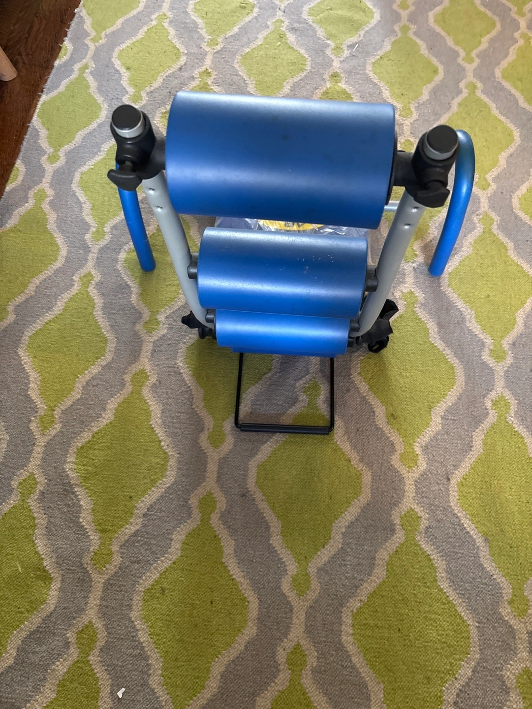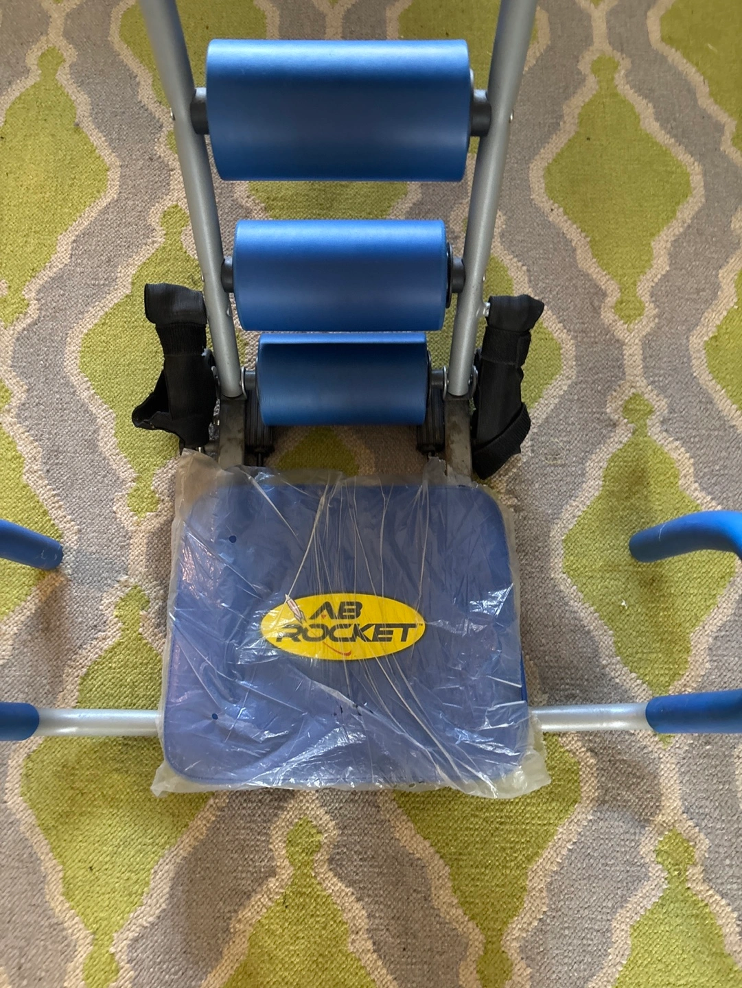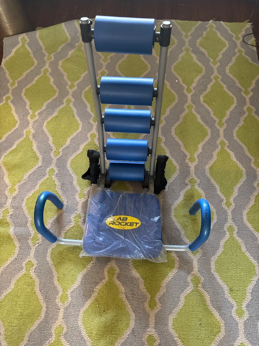 Ab Rocket ab roller exercise machine. Great for core workouts. Blue rollers and grey frame. Includes seat cushion.