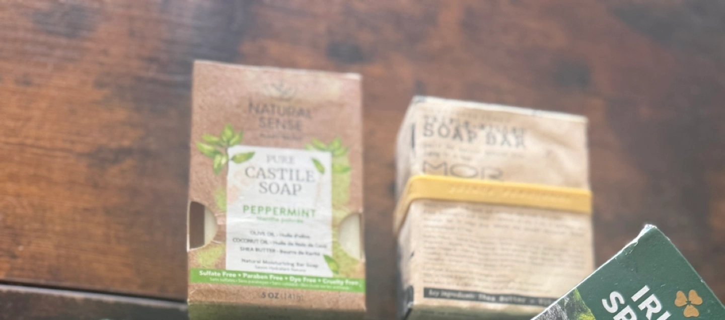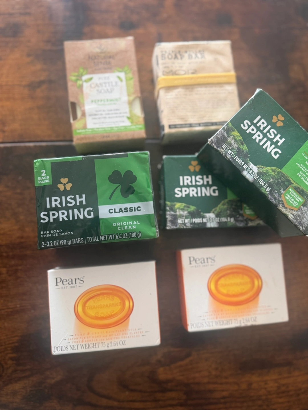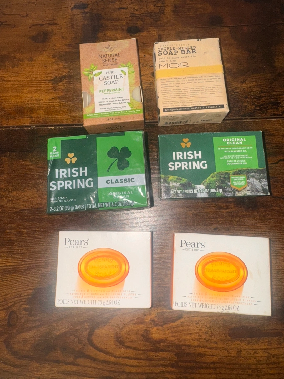 Collection of various bar soaps. Includes peppermint castile soap, Irish Spring, and Pears. Multiple bars of each type. 4x IRISH SPRING 1xPURE CASTILE SOAP PEPPERMINT 1xTRIPLE-MILLED SOAP BAR 2XPEAR SOAP