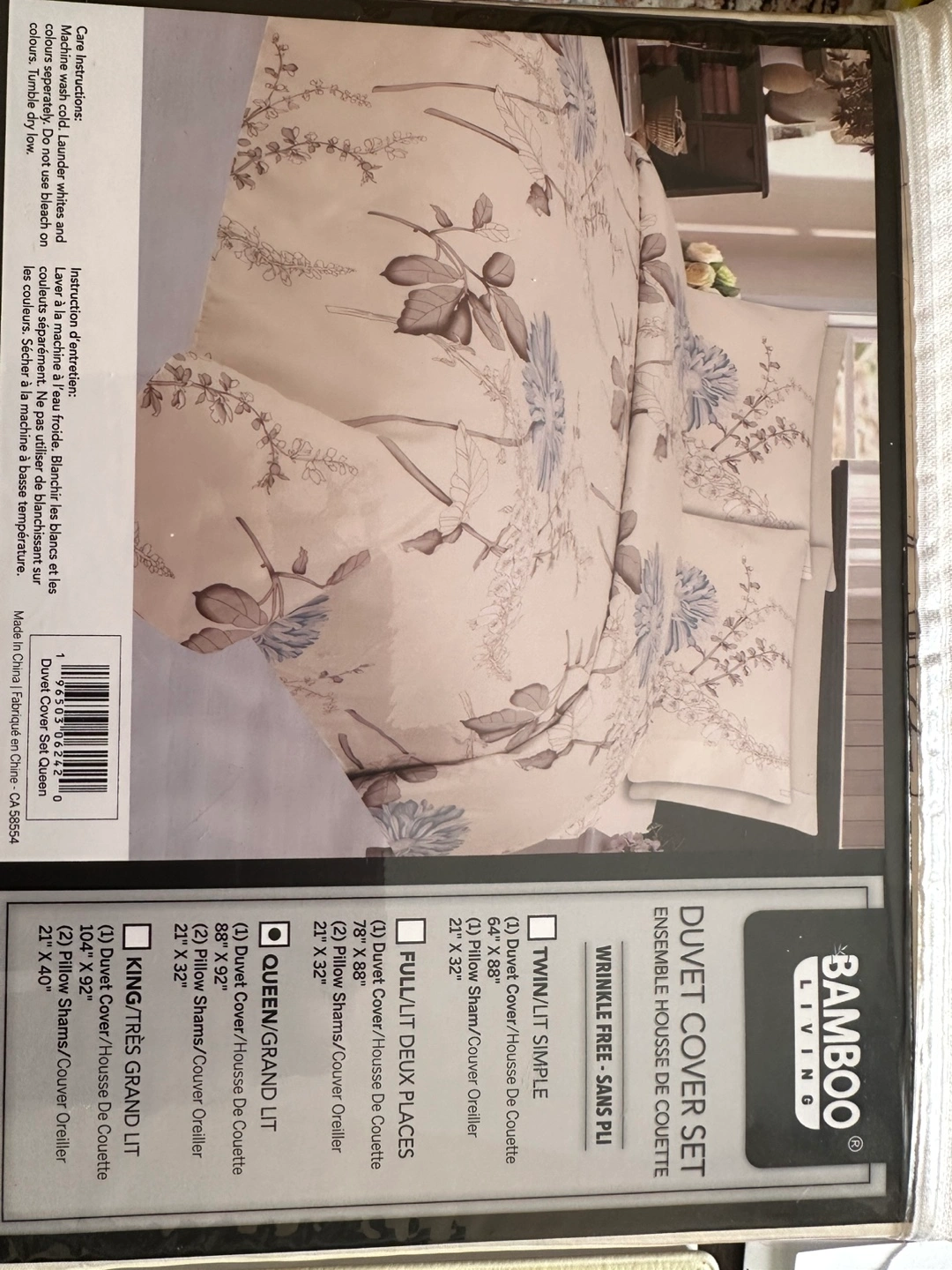 Queen size duvet cover set. Includes one duvet cover and two pillow shams. Floral print. Wrinkle-free. Machine washable.