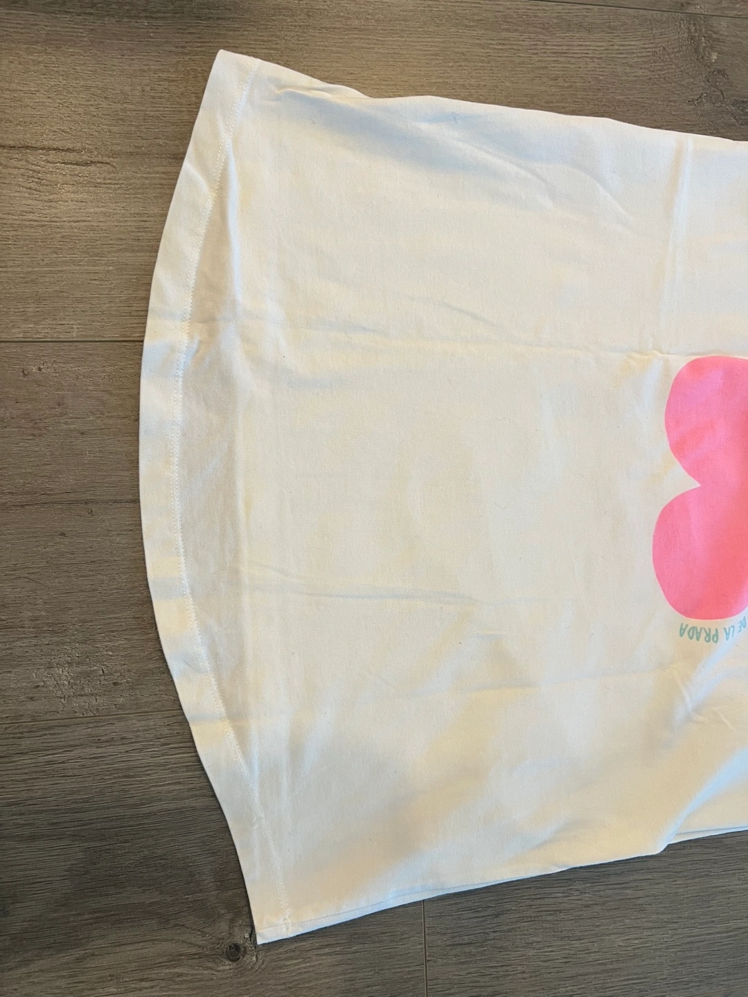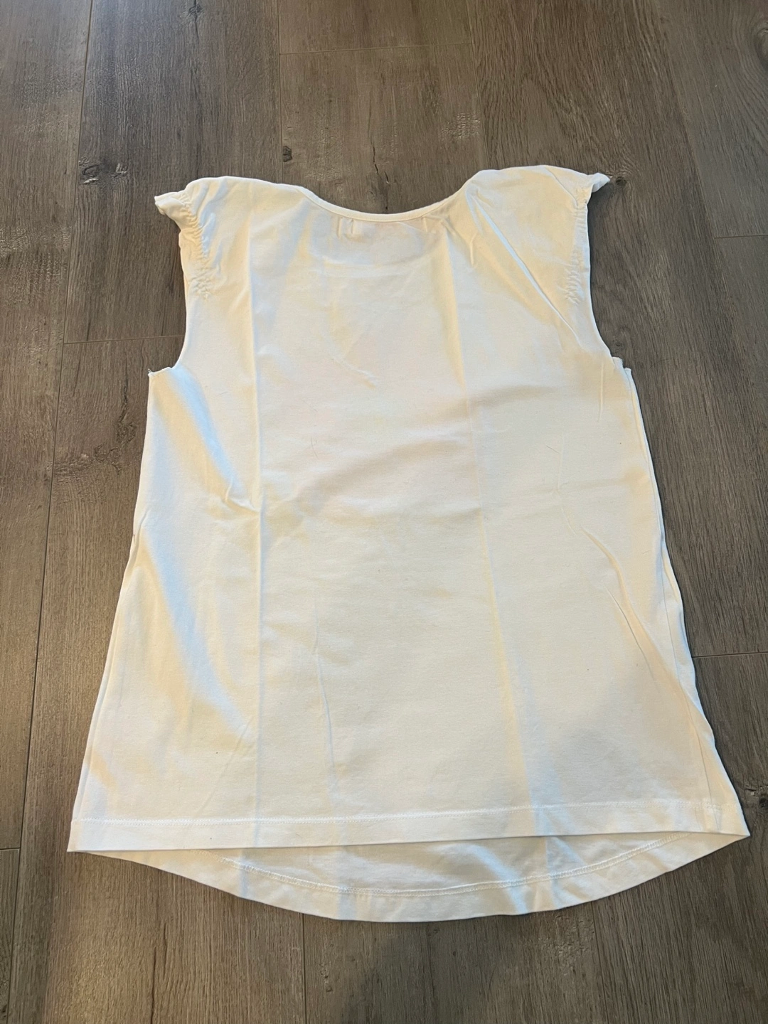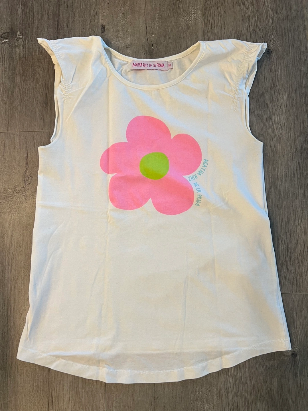 Adorable white sleeveless top. Features a large pink flower graphic. European Size 36. Small / Medium Matching skirt for sale as well