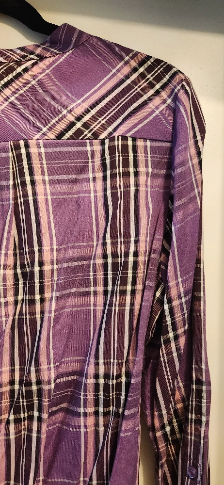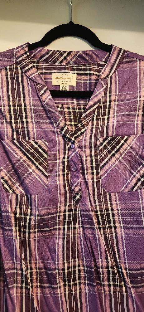 Original Weatherproof Vintage long sleeve shirt by David Peyser Sportswear. Plaid pattern in shades of purple, pink, white and black. V- neck with two middle buttons and two chest pockets. Sleeves are buttoned, cuffed and can be rolled up and secured with a forearm button. Soft light material made of 73% rayon and 27% polyester. a women's size medium. Comes with a spare button. Perfect condition.